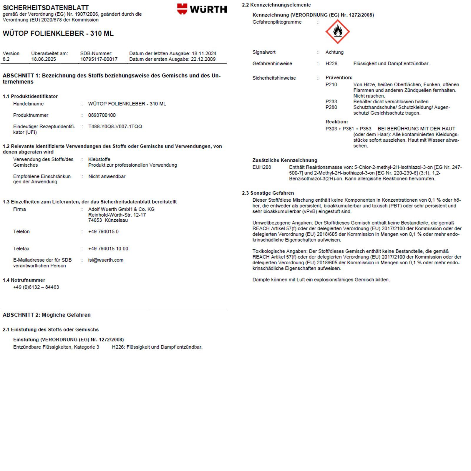 12x WUERTH WUETOP Folienkleber 0.31 LTR Systemkleber Abdichten Abkleben Standfest