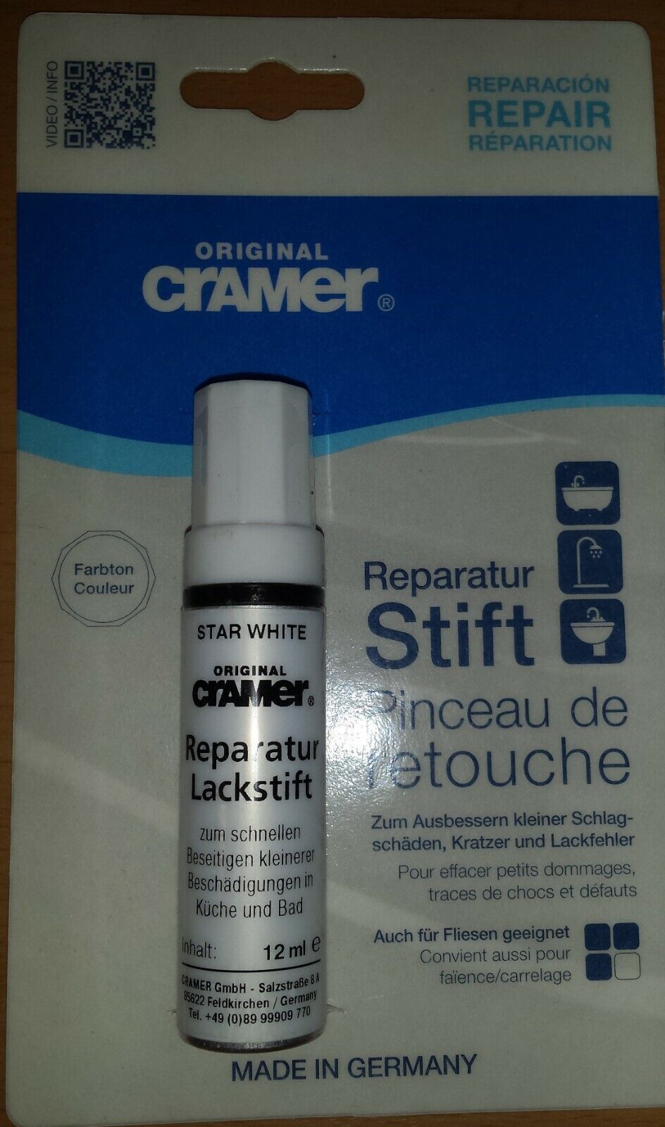 Cramer Reparatur-Stift 12ml für Keramik - Email - Acryl Farbe: Starwhite Beschreibung: Der Reparatur-Stift ist ein Ein-Komponentenspeziallack für Küche und Bad. Als Füllmasse und Decklack in einem, eignet sich der Lackstift zum ausbessern kleiner Schlagschäden, Kratzer und Lackfehler an Sanitärobjek