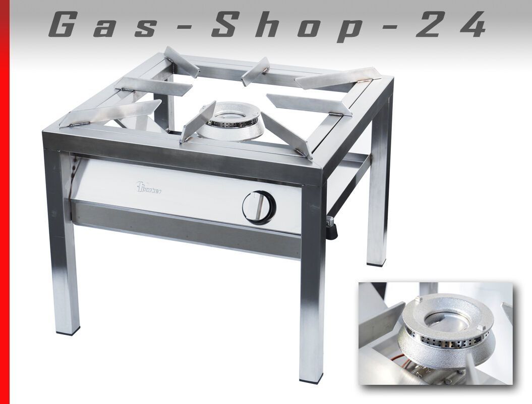 Hochwertiger Erdgas-Gastronomie-Hockerkocher in sehr massiver Edelstahlausführung, hoch belastbaren Topträgern, Zündbrenner und Zündsicherung. Auch für Gusseisen Riesenpfannen und XXL-Töpfe geeignet. Daten: Brennerleistung : 14 kW stufenlos regelbar mit Zündbrenner mit Zündsicherung heraussziehbares