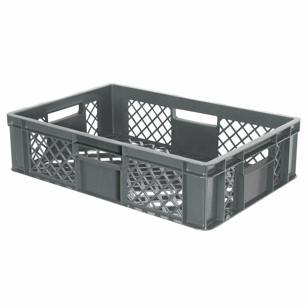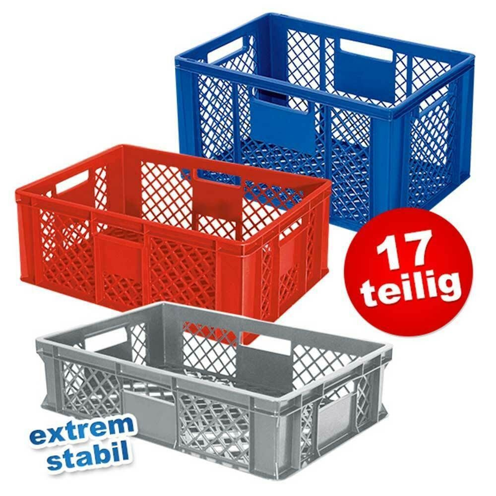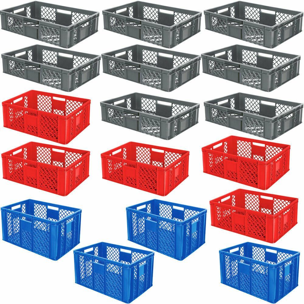 17 Bäckerkisten / Eurobehälter, LxH 600x400 mm, Höhe 150-320 mm, blau, rot, grau
