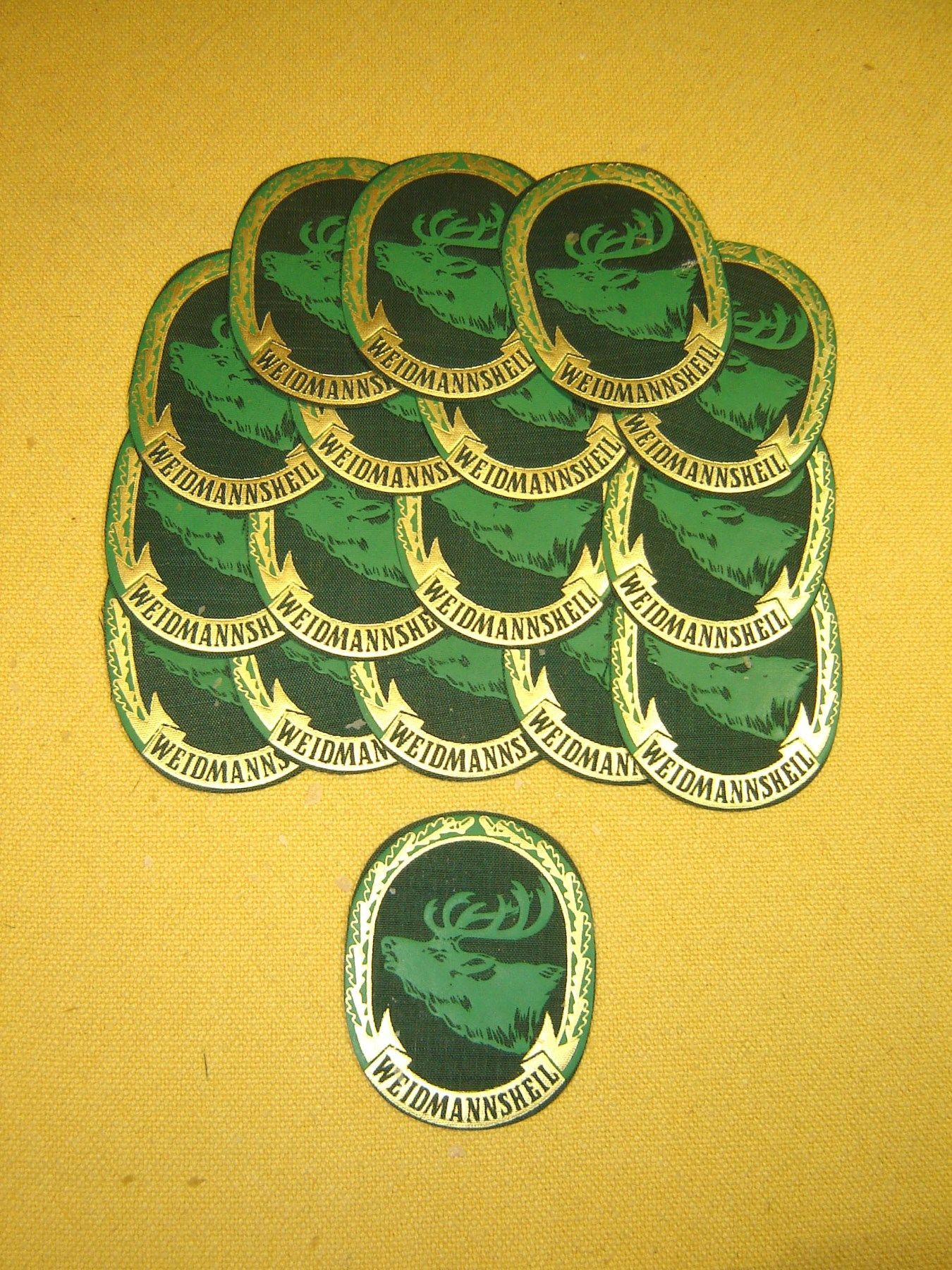 . 17 Stück Vignette für Jägerhüte Hirsch mit Waidmannsheil es waren mal einbügelbare Vignetten leider ist die Rückseite nicht mehr bügelbar man müsste Sie einkleben Größe ca 6,2 x 5 cm _ . Bitte sehen Sie sich hier alle meine anderen Artikel an . . Hut Hüte Huete Hat hats Hutreparatur hutwerkstaette