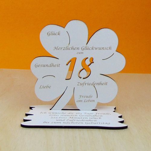 18. Geburtstag Gutscheingeschenk als Kleeblatt in 16 cm im Vintage Style, weiß. Ein Halter auf der Rückseite dient für einen Gutschein oder einen Geldschein. Ich wünsche dir 365 Tage Freude, 8760 Stunden Gesundheit 525.600 Minuten Glück und Zufriedenheit bis zum nächsten Geburtstag. Die Texte auf der Unterplatte sind in 14 verschiedenen Sprüchen erhältlich, siehe Shop.
