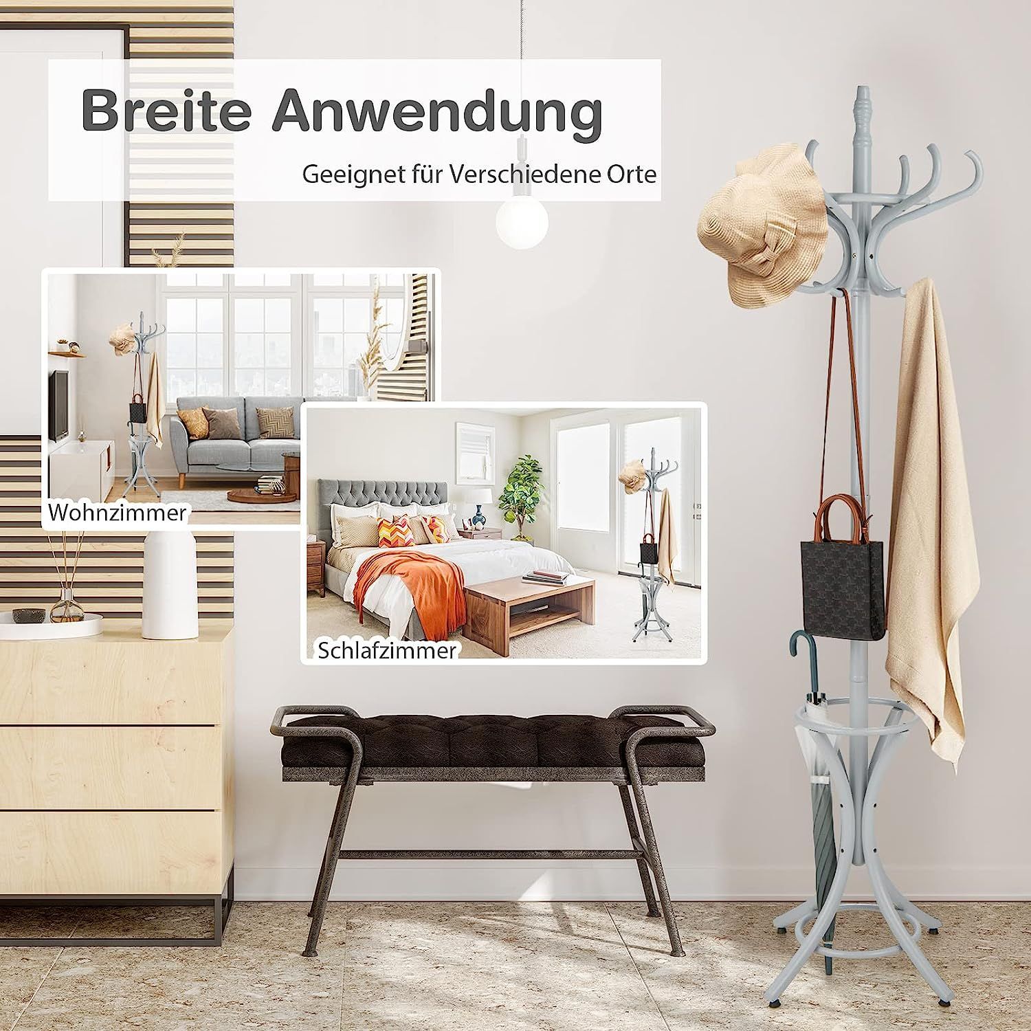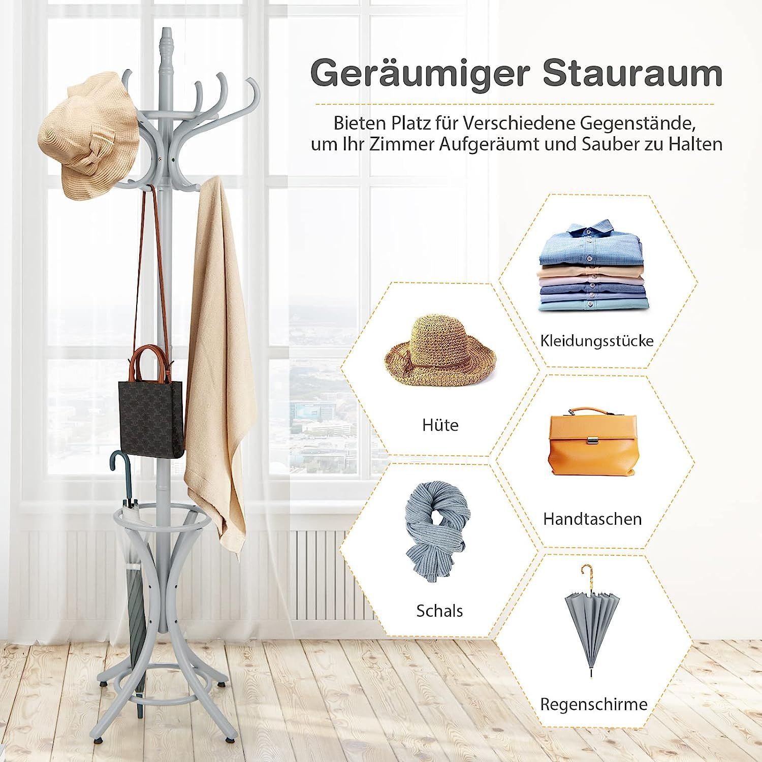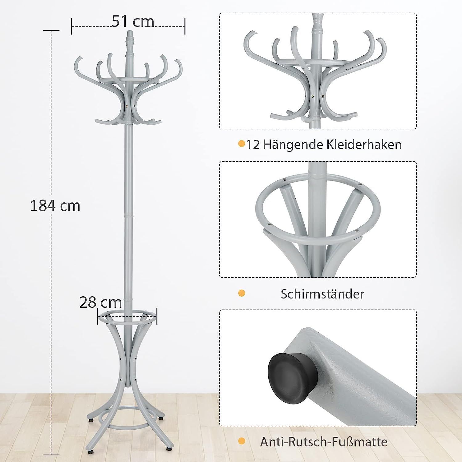 184cm Garderobenständer mit Schirmhalter, Jackenständer mit 12 Kleiderhaken, Grau