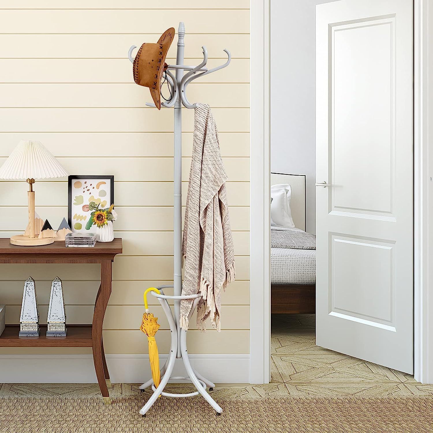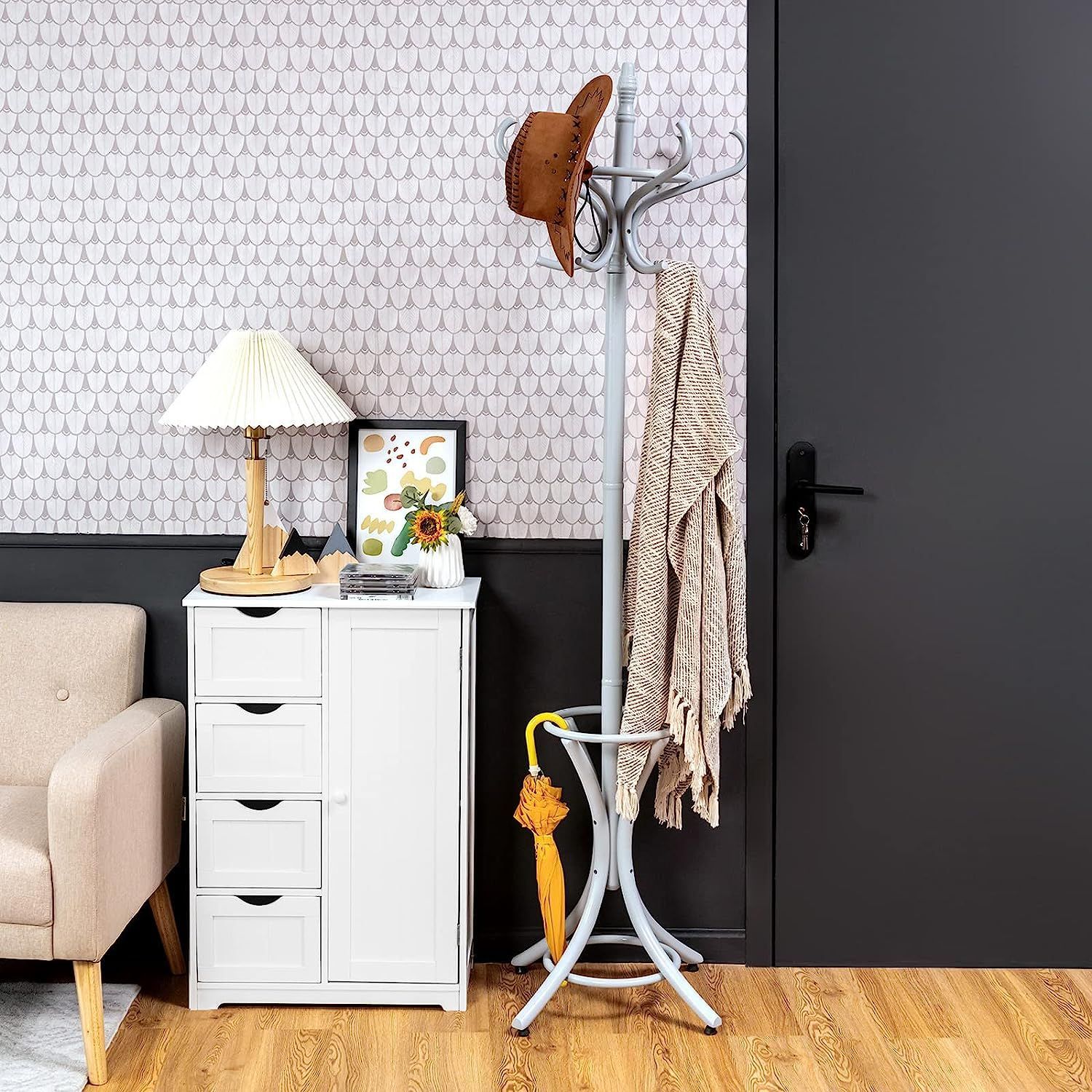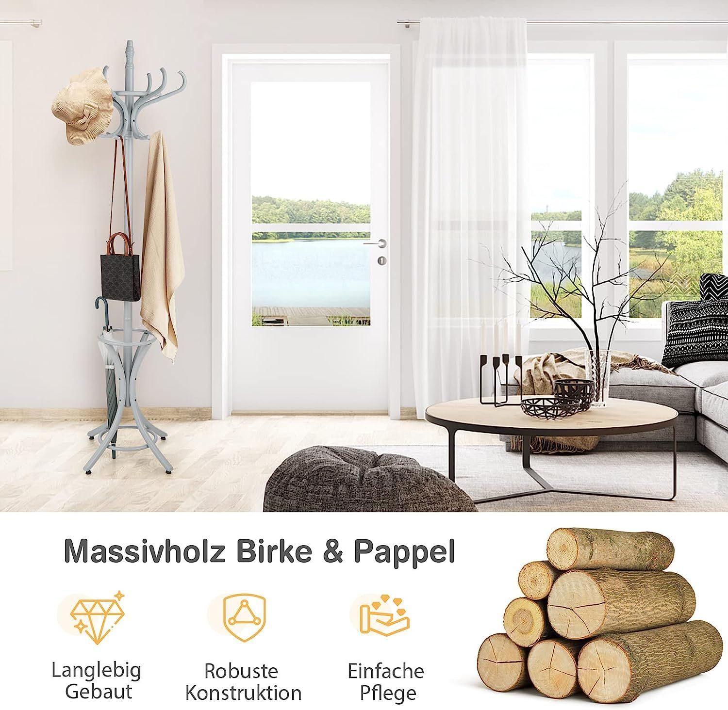 184cm Garderobenständer mit Schirmhalter, Jackenständer mit 12 Kleiderhaken, Grau