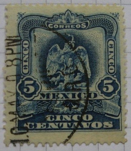 Auction item – Mexican stamp from the late 19th century. Features: - stamp series: Coat of arms and Mexican landmarks (1899) - stamp name: Emblem, - face value: 5 ¢ - Mexican centavo, - date of issue: 1899.11.01 , - size: 24 x 28 mm, - catalog codes; Michel MX 229, - colors: blue. I am di