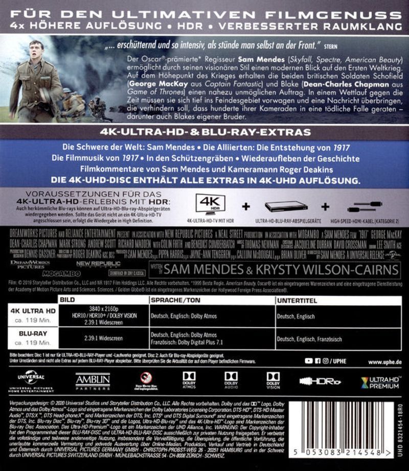 1917 (UHD+BR) 4K 2Disc Min: 123DD5.1WS - Universal Pictures