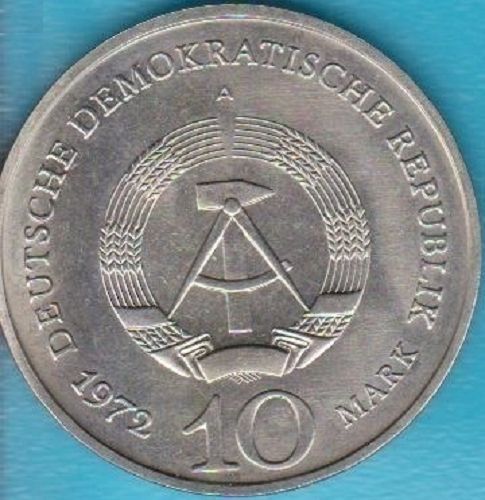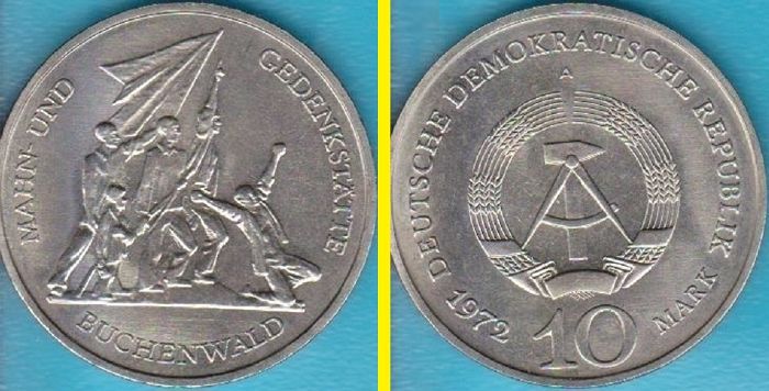 DDR 10 Mark 1972 Mahn- und Gedenkstätte Buchenwald (Stempelglanz) Daten der Münze: Metall: Neusilber Auflage: 3.553.920 Exemplare Diese Münze wurde lediglich zur Devisenbeschaffung der DDR in begrenzter Auflage für den Export ins Ausland geprägt und war nicht für den Währungsumlauf vorgesehen. Die P