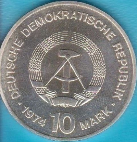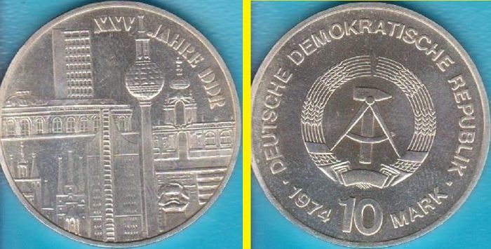 DDR 10 Mark 1974 XXV Jahre DDR (Stempelglanz) Daten der Münze: Metall: Silber Auflage: 52.585 Exemplare Diese Münze wurde lediglich zur Devisenbeschaffung der DDR in begrenzter Auflage für den Export ins Ausland geprägt und war nicht für den Währungsumlauf vorgesehen. Die Prägung wurde als Exportqua