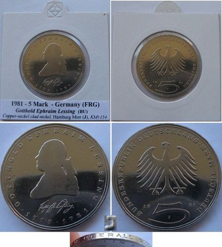1981, Germany-Federal Republic, 5 Deutsche Mark: Gotthold Ephraim Lessing, J
