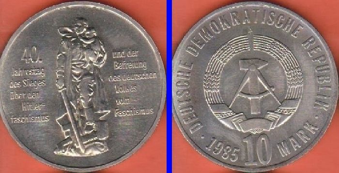 Normal 0 21 false false false DE X-NONE X-NONE DDR 10 Mark 1985 40 Jahre Befreiung (Stempelglanz) Daten der Münze: Metall: Neusilber Auflage: 606.010 Exemplare Diese Münze wurde lediglich zur Devisenbeschaffung der DDR in begrenzter Auflage für den Export ins Ausland geprägt und war nicht für den Wä