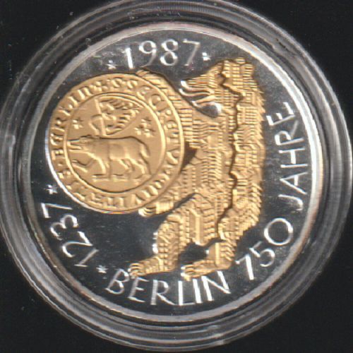 Normal 0 21 false false false DE X-NONE X-NONE MicrosoftInternetExplorer4 10 DM 1987 BRD 750 Jahre Berlin Vorderseite: Berliner Bär mit dem mittelalterlichen Stadtsiegel Rückseite: Deutscher Bundesadler Gewicht: 15,5 g Durchmesser: 32,5 mm Material: .625 Silber, .999 teilvergoldet Qualität: Polierte