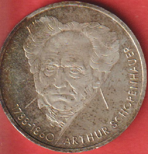 BRD 10 DM 1988 Arthur Schopenhauer 1788-1860 (bankfrisch) Daten der Münze: Metall: Silber (625er) Auflage: 8.000.000 Exemplare Eventuell auf dem Foto erkennbare Verfärbungen sind lediglich Alterspatina und stellen keinen Qualitätsmangel dar.
