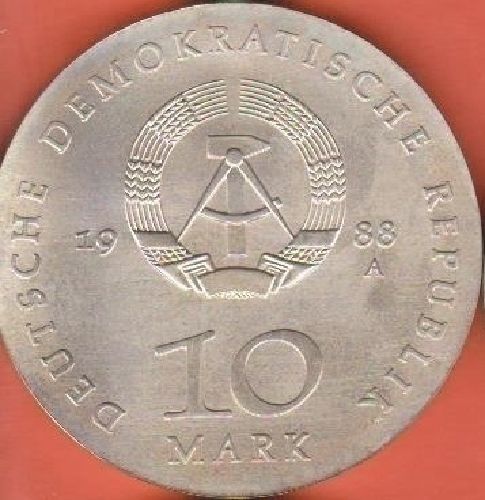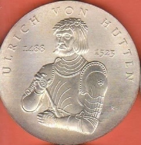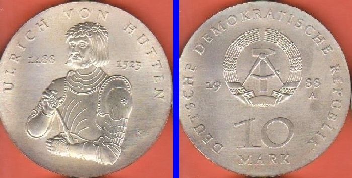 DDR 10 Mark 1988 Ulrich von Hutten 1488-1523 (Stempelglanz) Daten der Münze: Metall: Silber Auflage: 37.000 Exemplare Diese Münze wurde lediglich zur Devisenbeschaffung der DDR in begrenzter Auflage für den Export ins Ausland geprägt und war nicht für den Währungsumlauf vorgesehen. Die Prägung wurde
