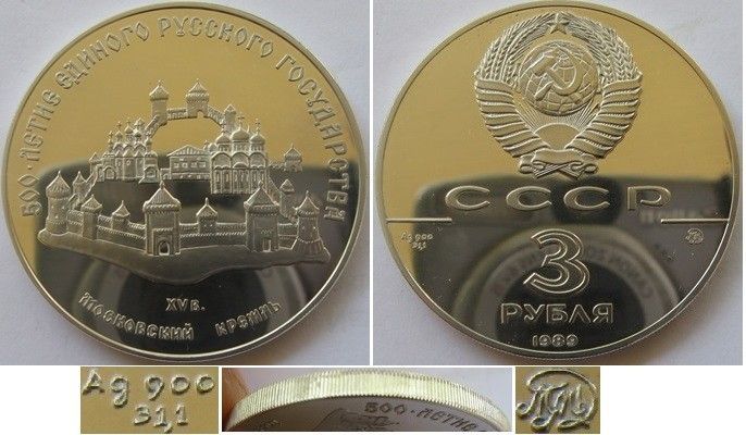 Auction item: 1989, USSR, one of the last Soviet rare silver coins (1 oz silver) - a Soviet commemorative 3-Rubles silver coin Moscow Kremlin”, from coin series: 500th Anniversary of the United Russian State” (Rarity index: 61). Features: composition: silver .900, face value: 3 Rubles, b