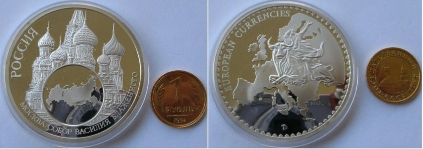Auction item – a commemorative issue, medal: Russia - European Currency Introduction”. Obverse: gilded 1 rubel 1991 coin over Cathedral Vasils Blashenny in Moscow. Reverse: Europa Abduction and map of Europe, lettering: European Currencies”. Edge: plain. Diameter: 51 mm, Material: