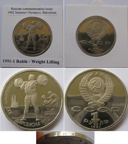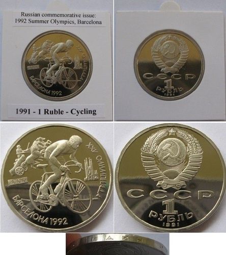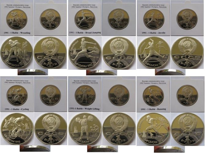 Auction set – USSR , 19 91 , a set 6 pcs c ommemorative s 1 Ruble coins: 1992 Summer Olympics, Barcelona ”. The set consists of the following 6 coins: Cycling”, Wrestling”, Javelin”, Weight Lifting”, Broad Jumpings”, Running”. The coins are in numismat