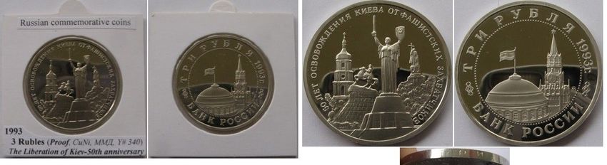 Auction coin: Russia, 3 rubles 1993, a commemorative issue: The 50th Anniversary of the Liberation of Kiev from Fascist Invaders”. Features: proof-like, composition: copper-nickel, weight: 14.55 g, diameter: 33.0 mm, Moscow Mint, Mintage: 350 000 pcs, a coin in a numismatic holder. Edge: two i
