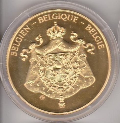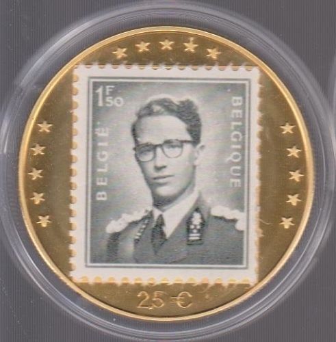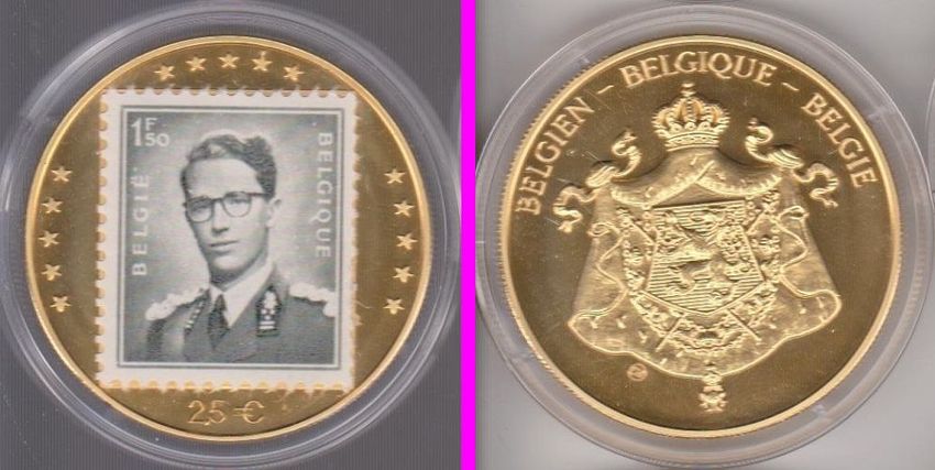 2,5 EURO-Probe Belgien 1998 König Baudouin mit 1,50 F. Briefmarke Daten der Münze: Metall: Kupfer Nickel vergoldet Durchmesser: 38 mm Gewicht: 32 g Erhaltung: Stempelglanz Vorderseite: 1,50 F. Briefmarke König Baudouin , Nennwert 2,5 € , 15 Sterne Rückseite: Staatswappen Belgiens, Umschrift BEL