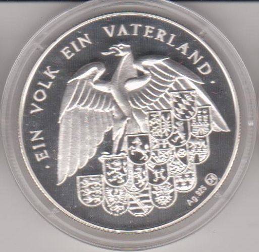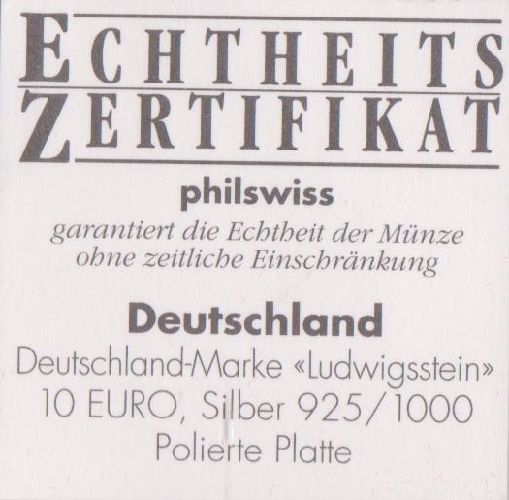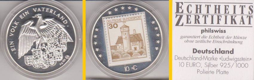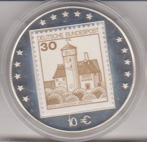 10 EURO-Probe Deutschland 1998 Ein Volk ein Vaterland mit Deutschland-Briefmarke Ludwigsstein Daten der Münze: Metall: Silber 925 Durchmesser: 38 mm Gewicht: 28 g Erhaltung: Polierte Platte Vorderseite: Briefmarke im Kreis von 15 Sternen, Nennwert 10 € Rückseite: Bundesadler mit den Wappen der