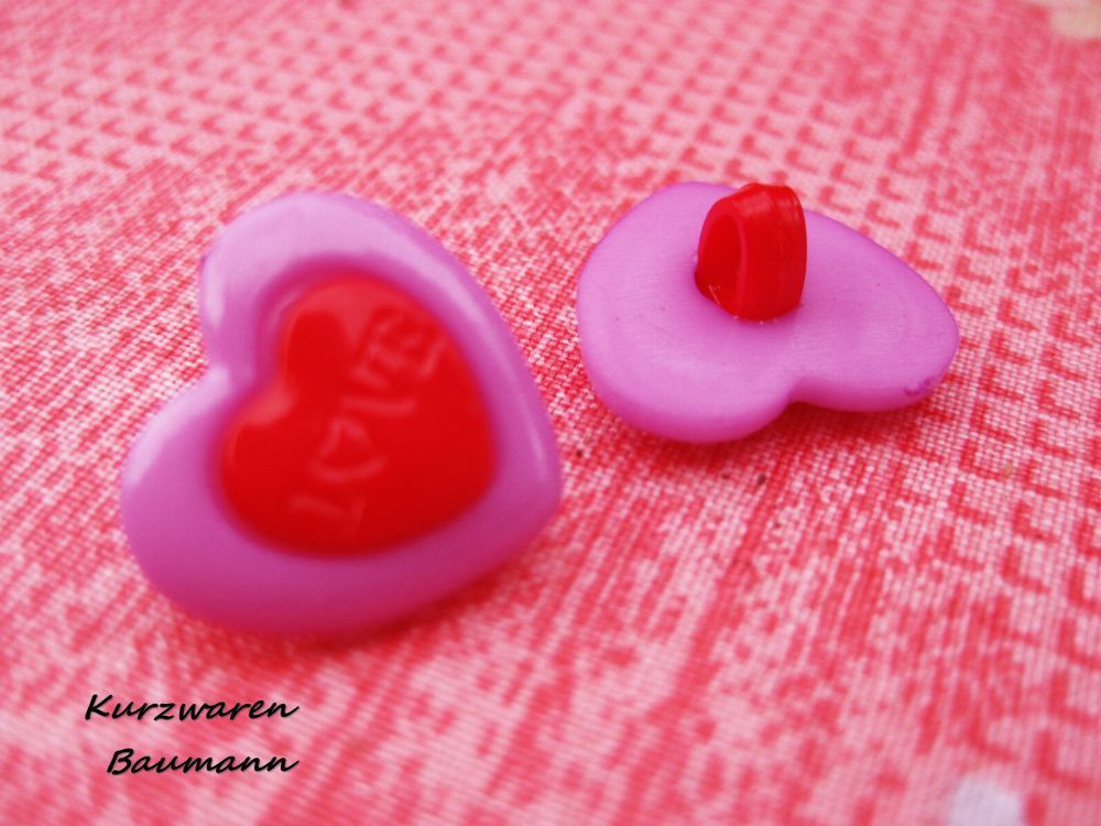 1Kunststoffkinderknopf Herz lila/ rot 15x6mm Öse4mm Nr1197