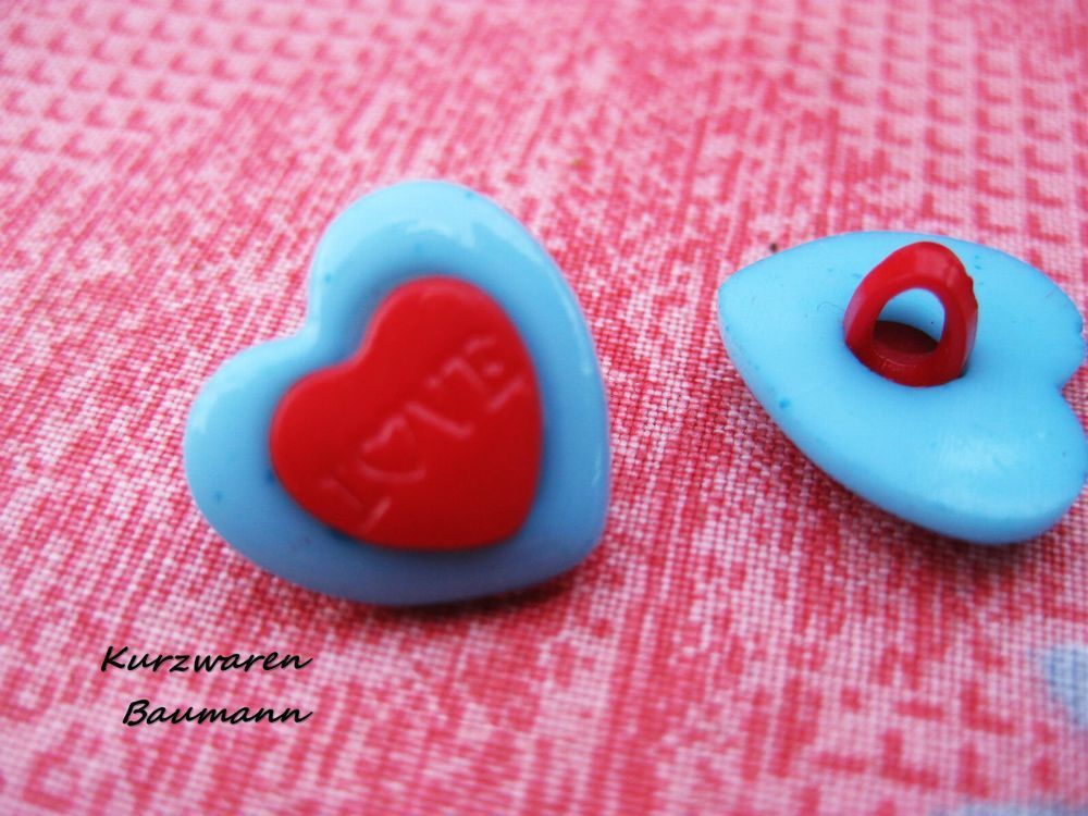 1Kunststoffkinderknopf Herz türkis/ rot 15x6mm Öse4mm Nr1196