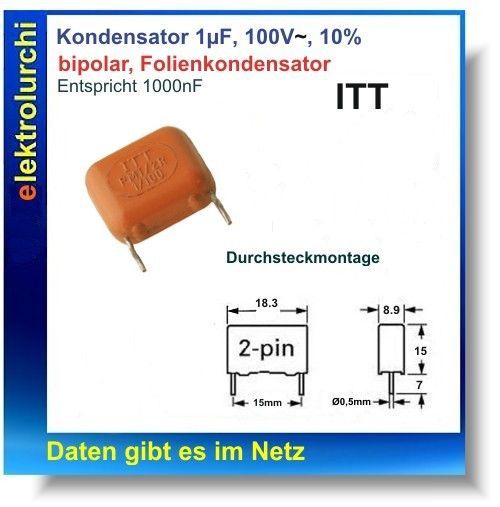 Sie bieten hier auf folgenden Artikel 1 Stück 1uF, 100V- ,10%, PMT 2R, Folien Kondensator Metall-Pol. RM15mm, ITT Artikelbezeichnung: 1uF =1000nF 100V- Typ: Folienkondensator Abmessungen LxBxH: 18,3 x 8,9 x 15mm Toleranz: 10% Rastermaß: 15,0mm Hersteller: ITT