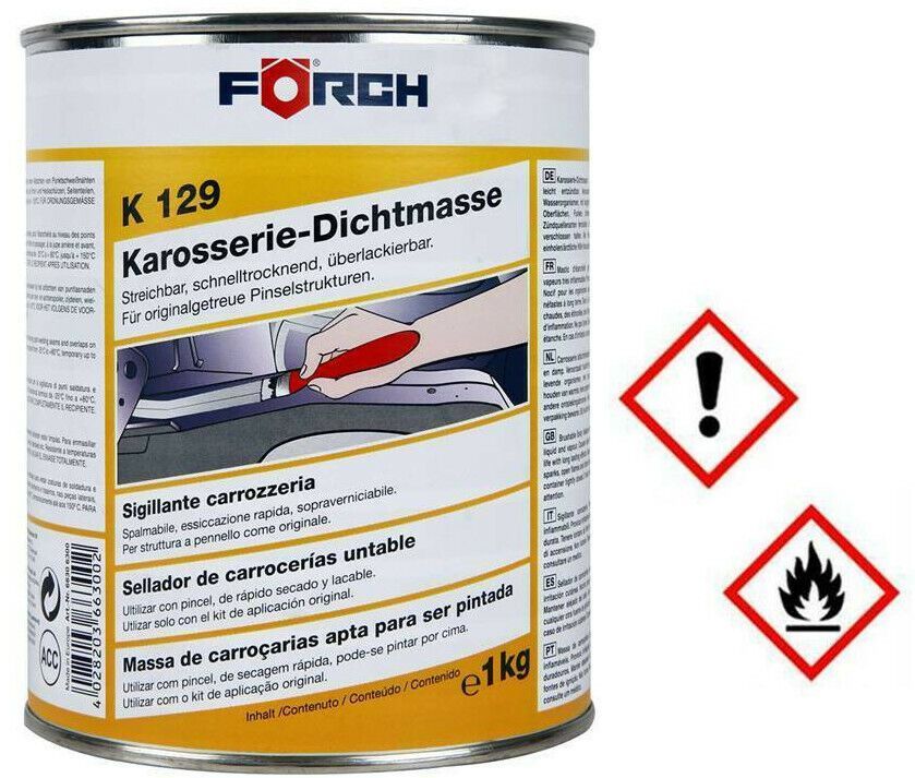 Förch - Karosserie-Dichtmasse K129 Lieferumfang: 1x 1kg Dose Anwendbar auf blanken, grundierten sowie lackierten Flächen.Zum Abdichten von Punktschweißnähten und Überlappungen an der Bodengruppe im Fahrgestell- und Kofferraum, an Front- und Heckschürzen, Seitenteilen, radkästen etc. Für originalgetr