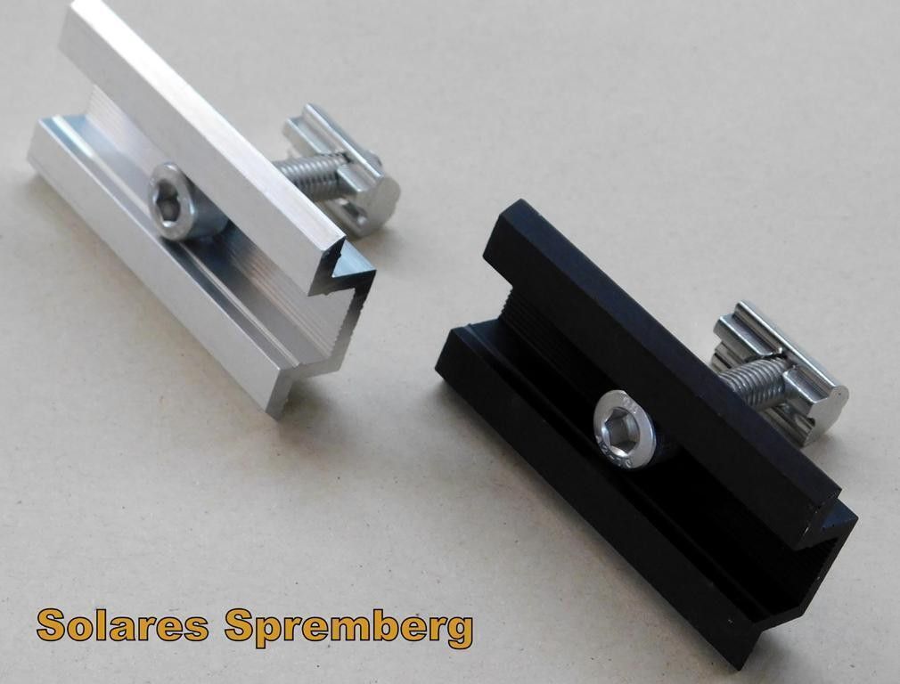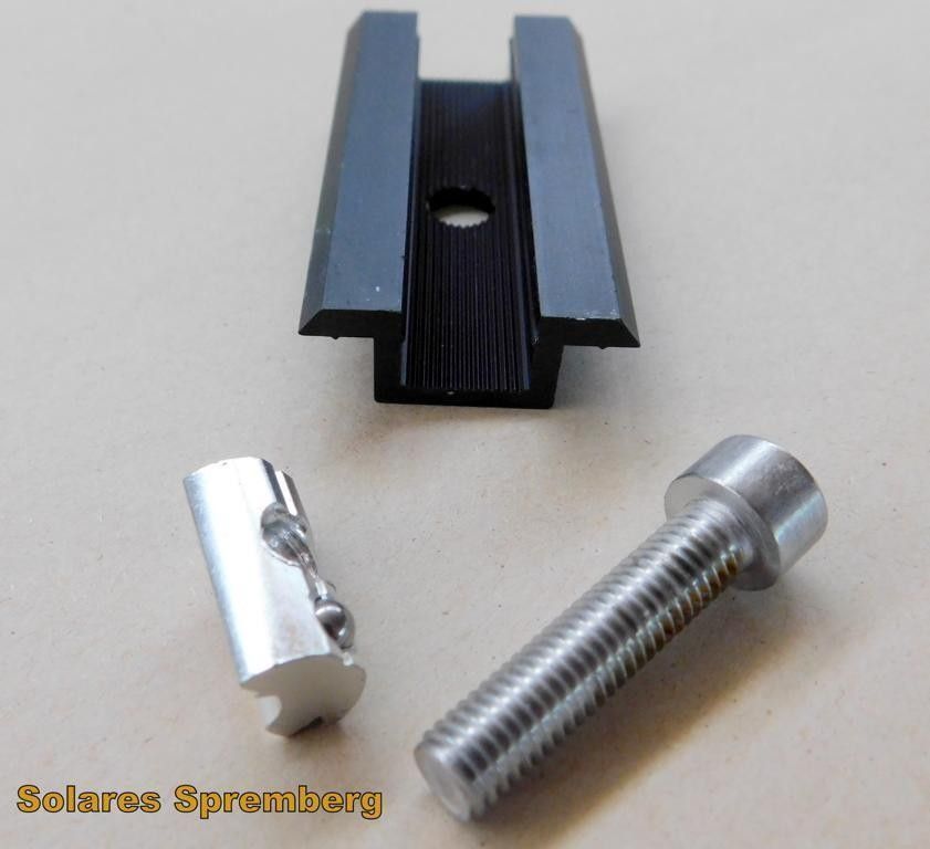Passend für alle Nut 8 Anbindungen unserer Montageprofile - 1X MITTELKLEMME mit 70mm Länge, vorkonfektioniert für gerahmte Module mit 28-50mm Höhe in blank oder schwarz eloxiert Die Klemme besteht aus: 1x Mittelklemme (Aluminium) 1x Zylinderkopfschraube M8 (Edelstahl) 1x Nutenstein (Aluminium) Passt