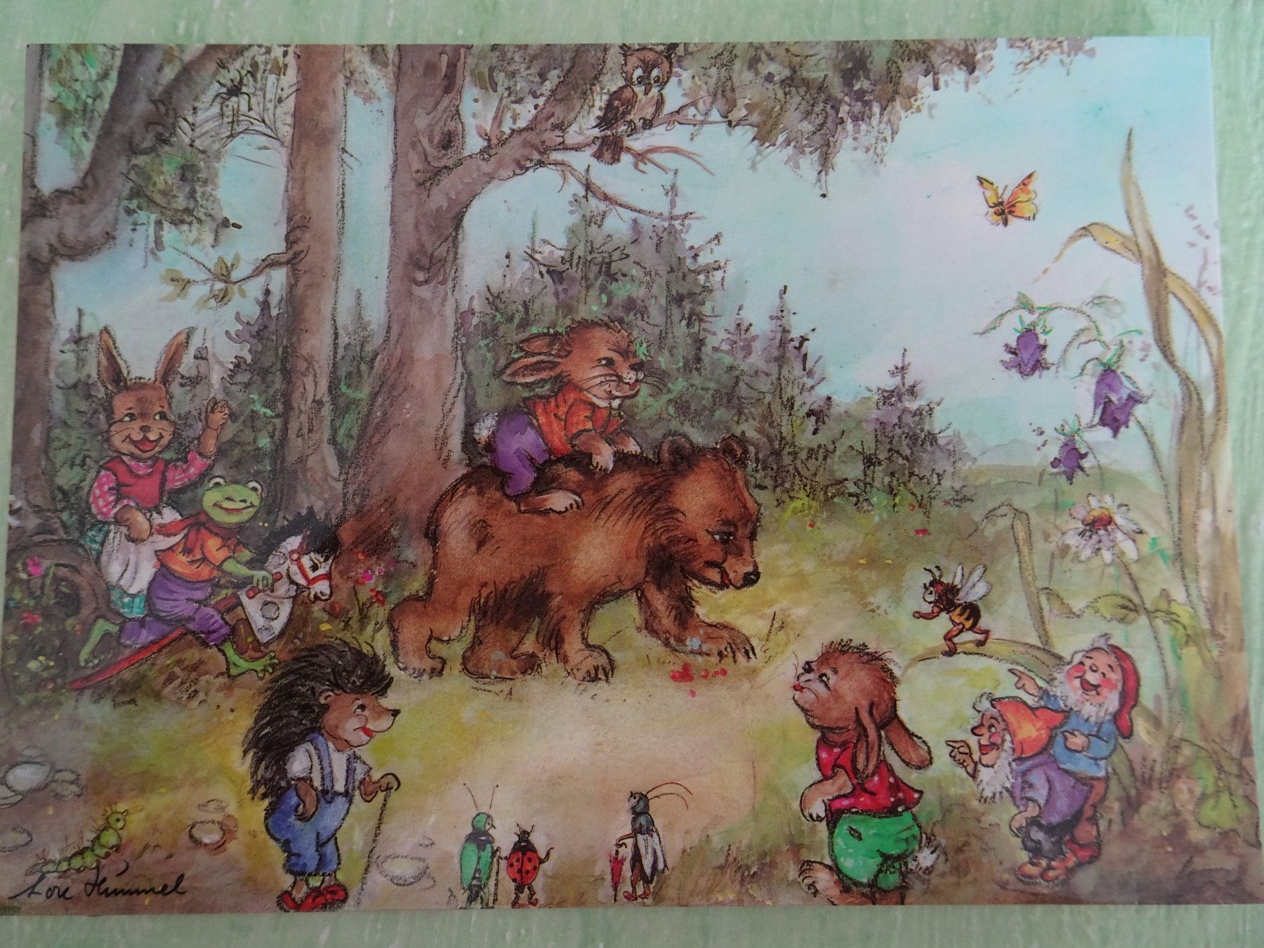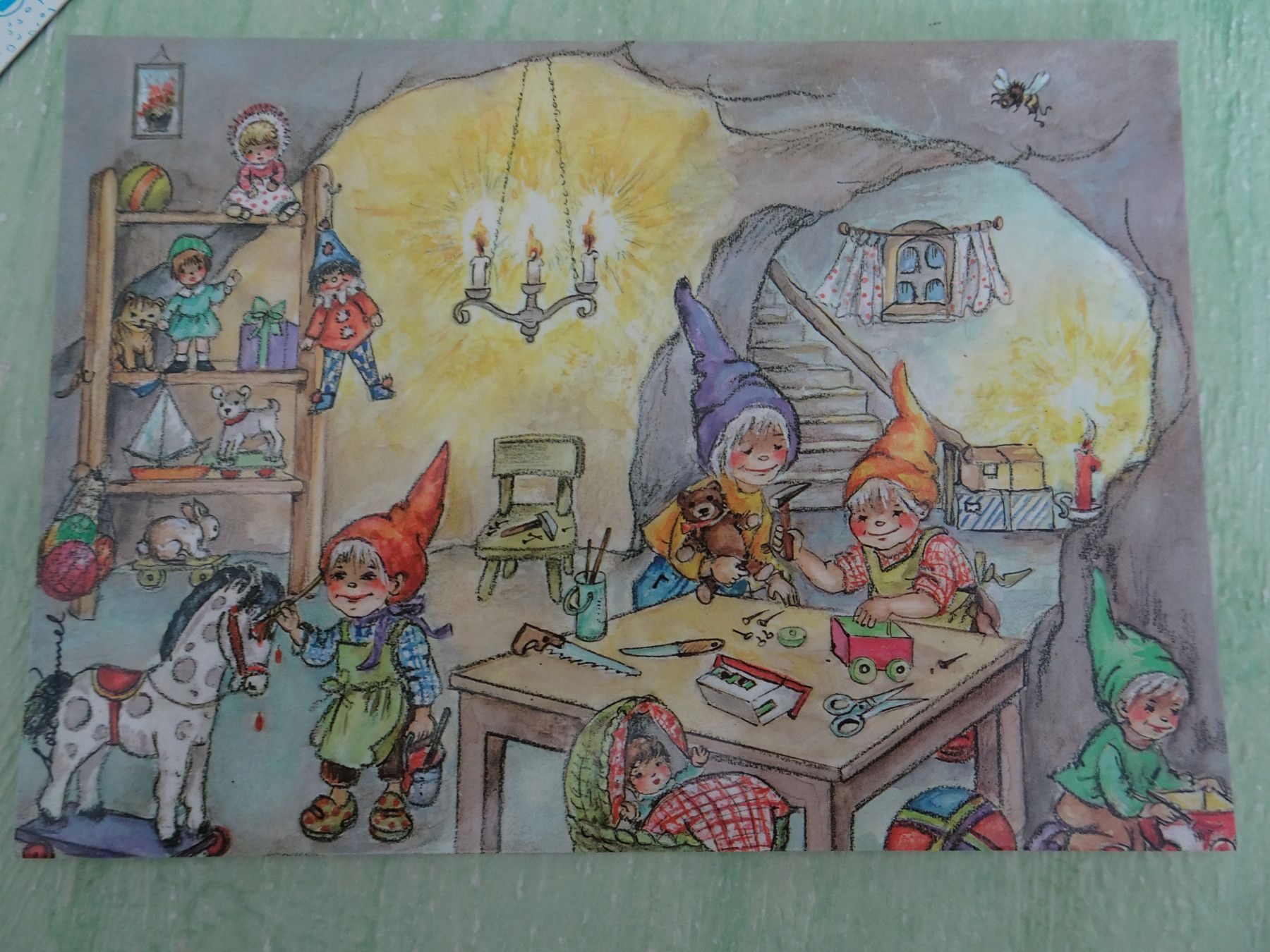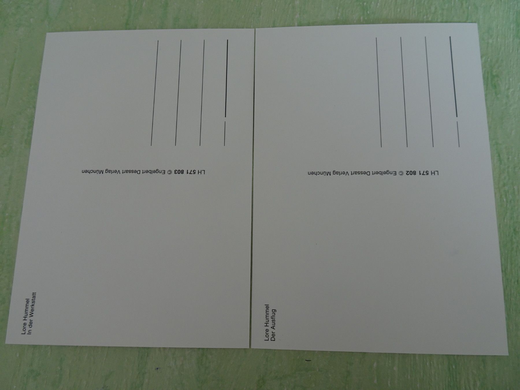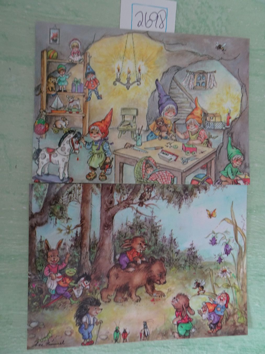 2 alte Postkarten AK Lore Hummel Engelbert Dessart Wichtel Zwerge Werkstatt Ausflug