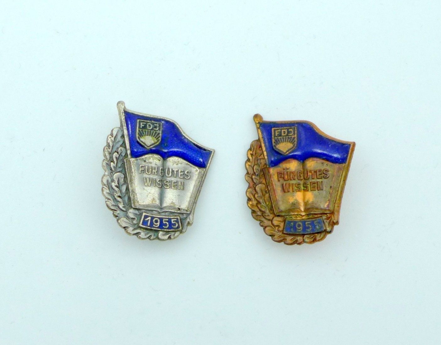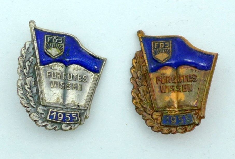2 DDR Abzeichen FDJ silbern 1955 Für gutes Wissen bronze Buch Nummer