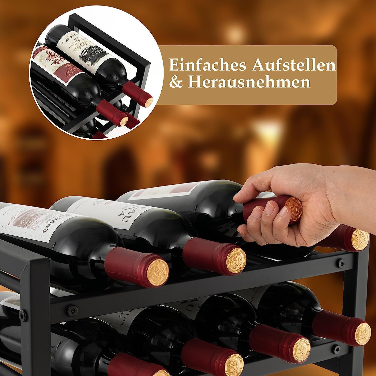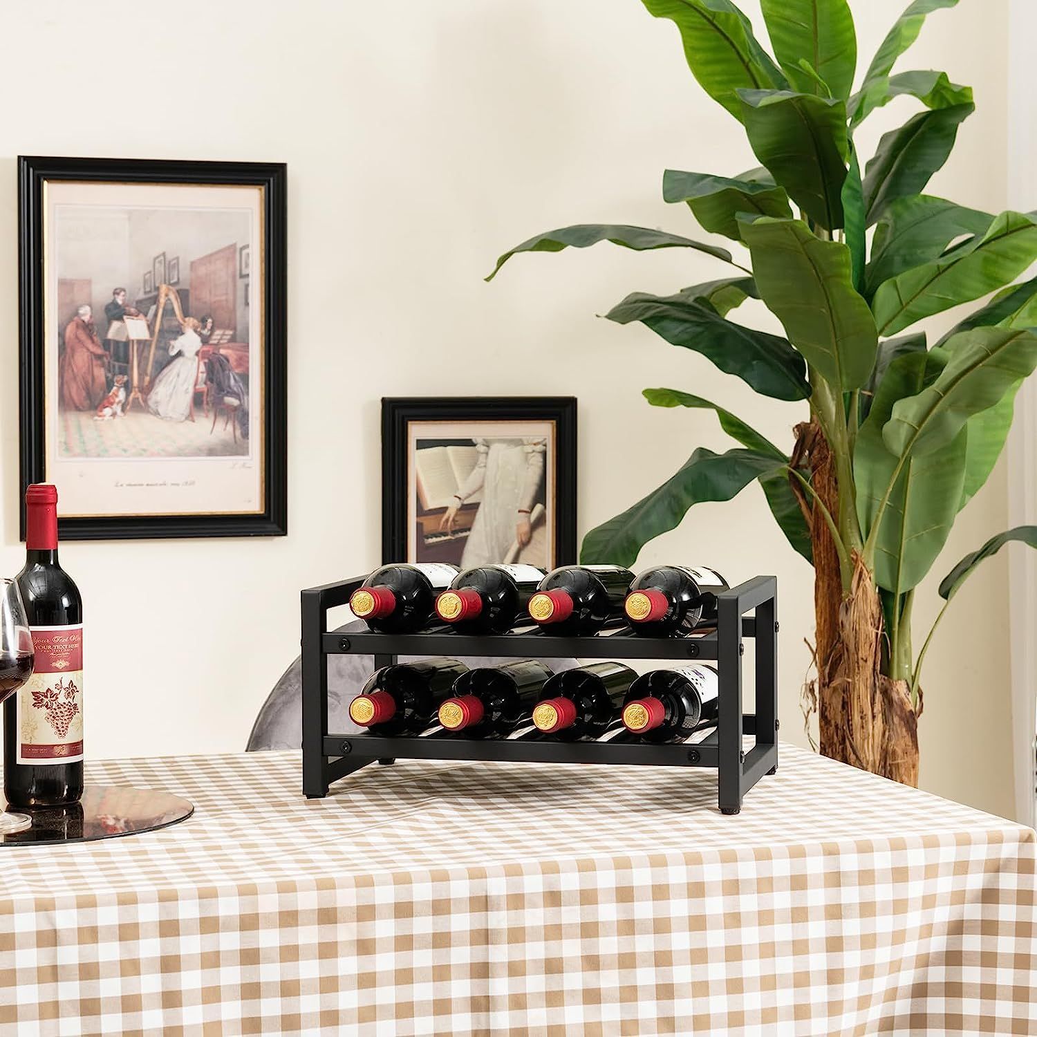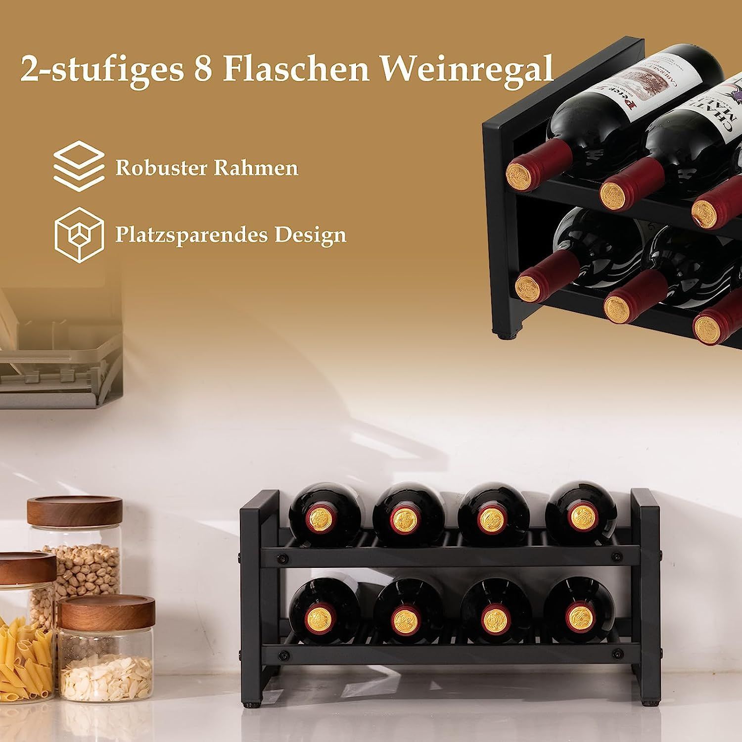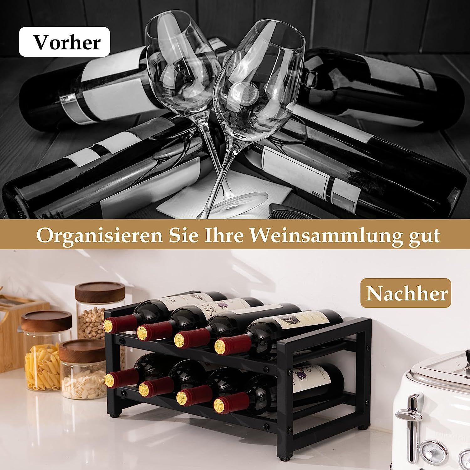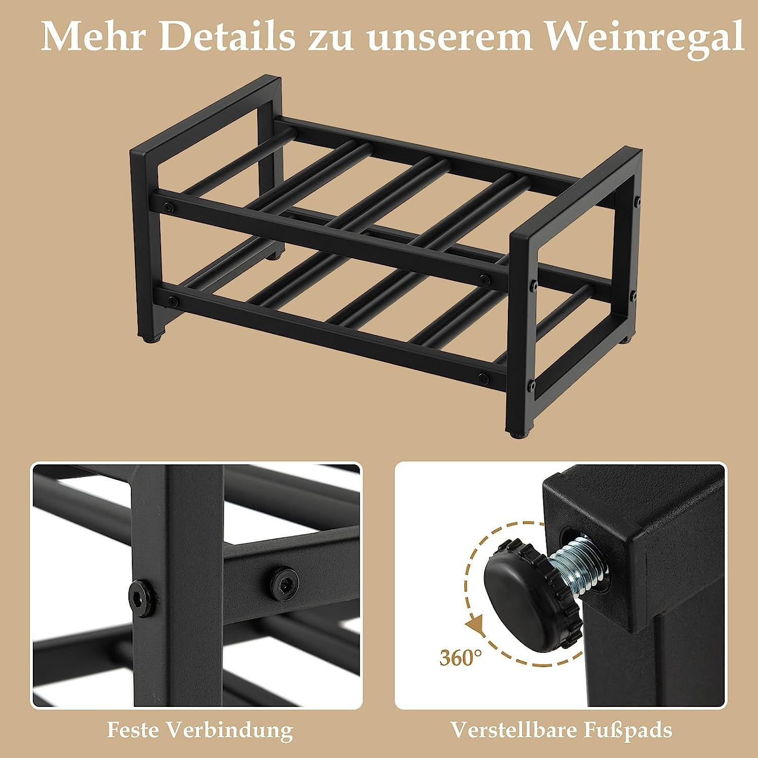 2 Ebenen Weinregal aus Metall, Flaschenständer Weinständer für 8 Flaschen, Schwarz