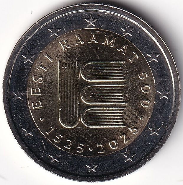 Bezeichnung Designation: 2 Euro Gedenkmünze Estland Titel title: 500. Jahrestag d. Einführung d. Estnischen als Schriftsprache Ausgabjahr Year of issue: 2025 Legierung alloy: CuNi CuZn Erhaltung, Größe: ST, Durchschitt 25,75 Auflage Edition: 988.000 Stück Zustand Status: unzirkuliert Bankfrisch Verp