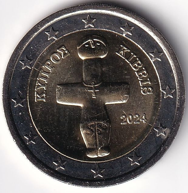 Bezeichnung Designation: 2 Euro Münze Zypern Titel title: Idol von Pomos Ausgabjahr Year of issue: 2024 Legierung alloy: CuNi CuZn Erhaltung, Größe: ST, Durchschitt 25,75 Auflage Edition: . . Stück Zustand Status: unzirkuliert Bankfrisch Verpackung Packaging: verschlossener Beutel Sonstiges Other: D