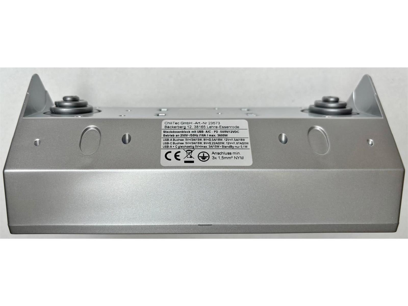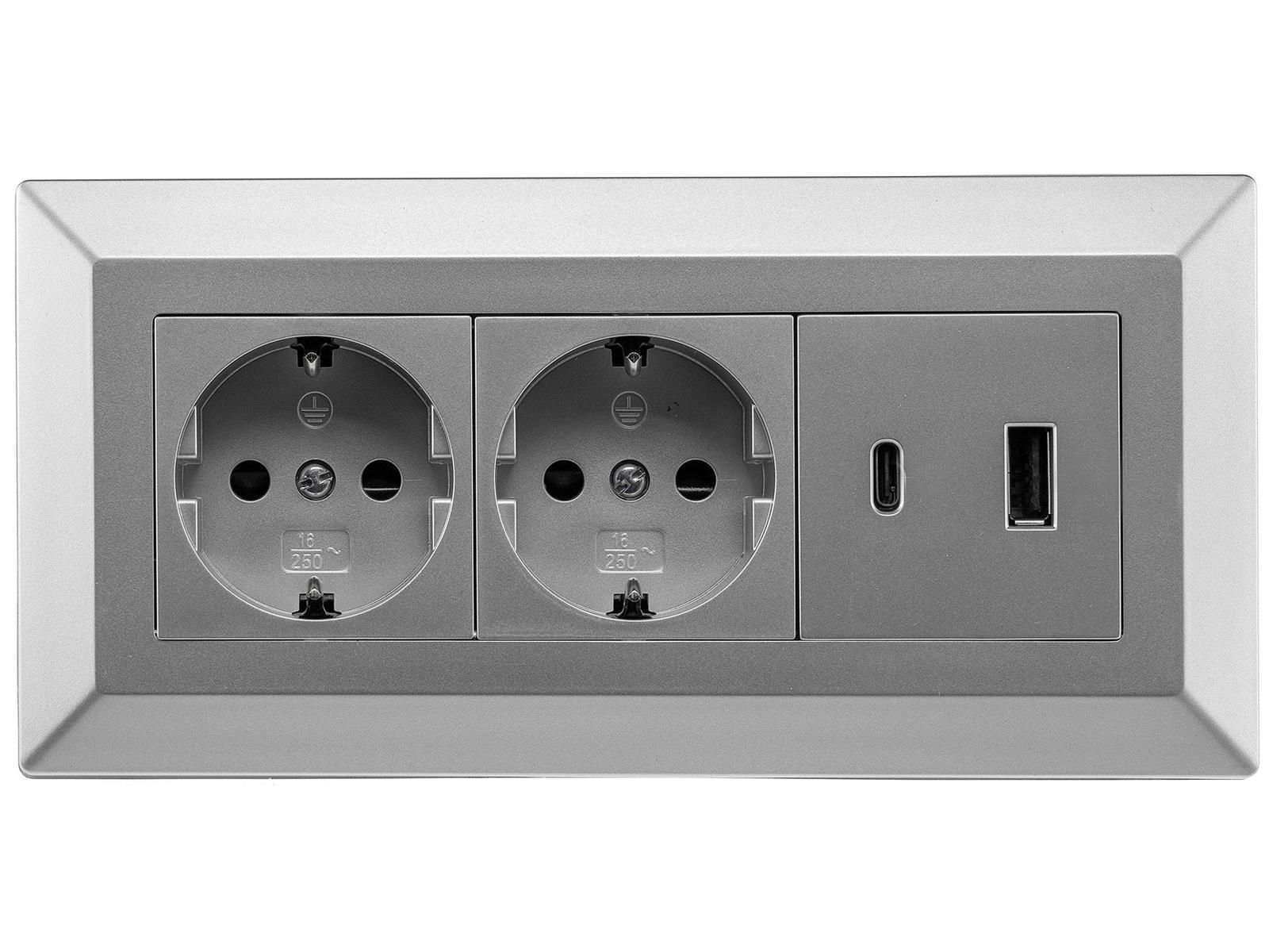 ChiliTec 2-fach Steckdosenblock, USB-A+C, silber 250V / 16A, Aufbaumontage, USB 3,1A, PD