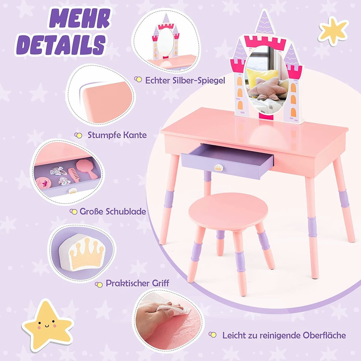 2 in 1 Kinder Schminktisch mit Hocker, Schminktisch-Set aus Holz mit Schublade, Rosa