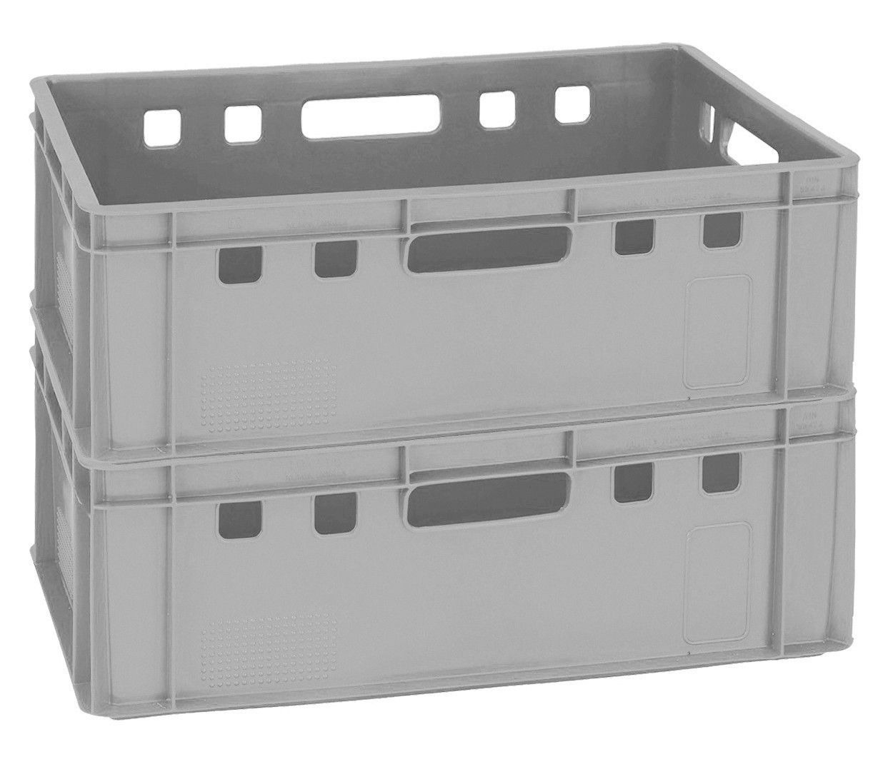 2 Stück Metzgerkiste Lagerbehälter Fleischerkiste grau E2 neu Gastlando Dieser praktische Aufbewahrungsbehälter mit 2 Transportgriffen ist besonders für die Fleischindustrie geeignet. Dieses ist ein extrem widerstandsfähiges und elastisches thermoplastische Copolymer. Die Kiste in der Euronorm-Größe E2 (60 x 40 x 20 cm) ist lebensmittelneutral, stapelbar und sorgt für eine geruchs- und geschmacksneutrale Lagerung.Sie ist für die Hochdruckreinigung geeignet