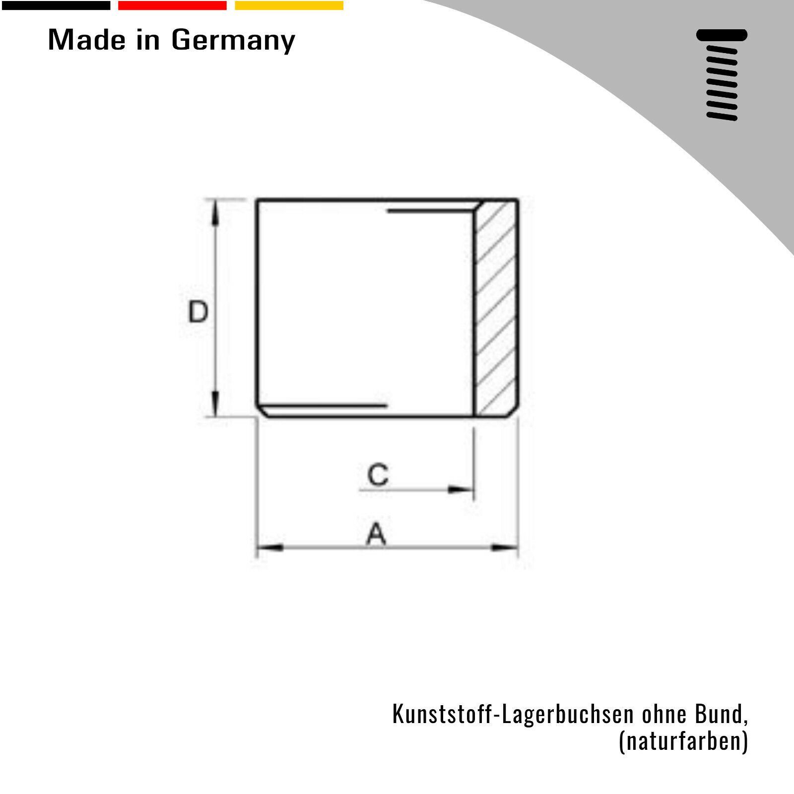 2 Lagerbuchsen, Kunststoff Polyamid, Naturfarben, ohne Bund Die Maße bezeichnen: Bohrung x Schaftdurchmesser x Gesamthöhe C x A x D Bei den Abmessungen können Toleranzen auftreten! Entdecken Sie auch unsere anderen Angebote Filzgleiter, Möbelfüße, Unterlegscheiben, und vieles mehr… Günstige Preise,