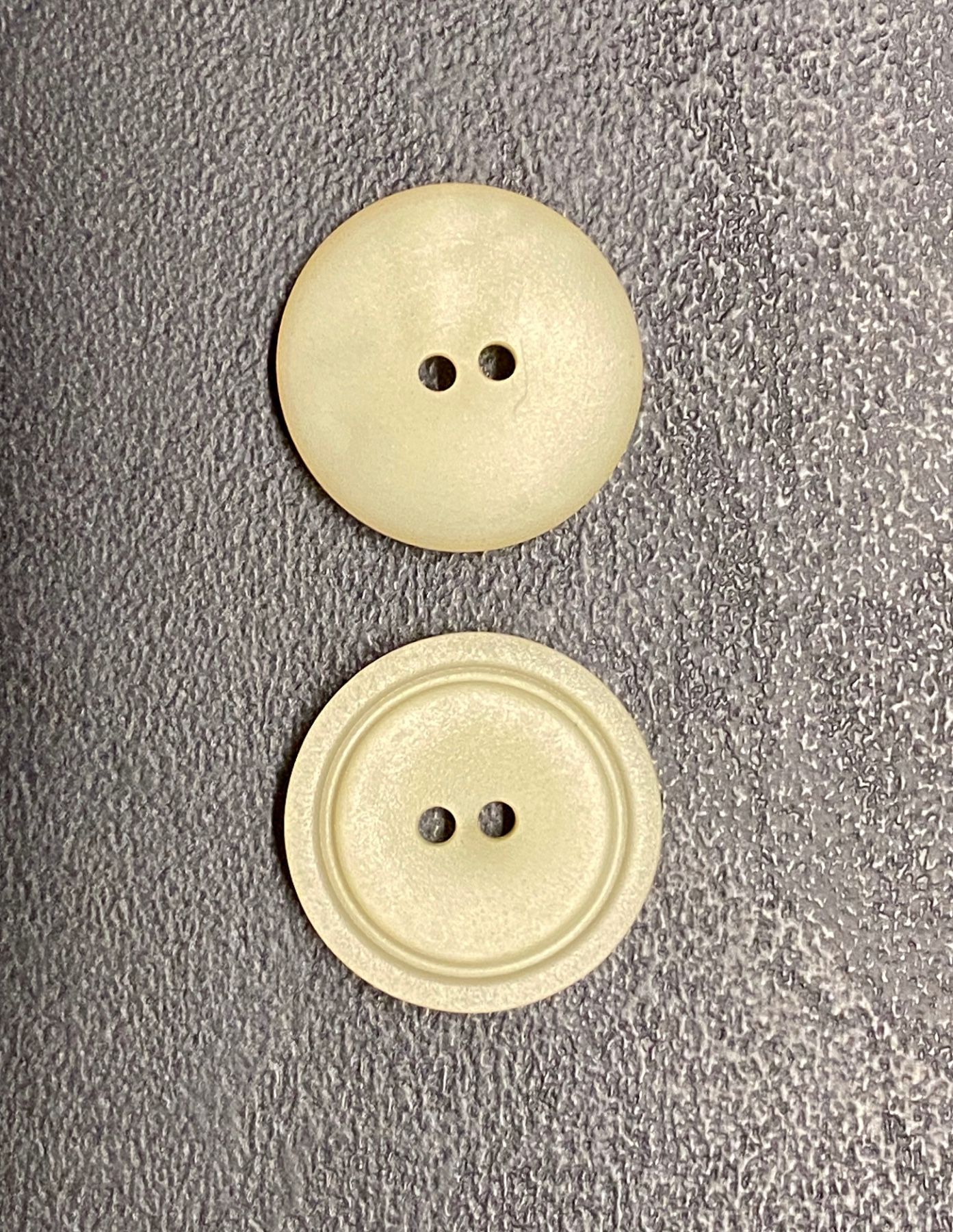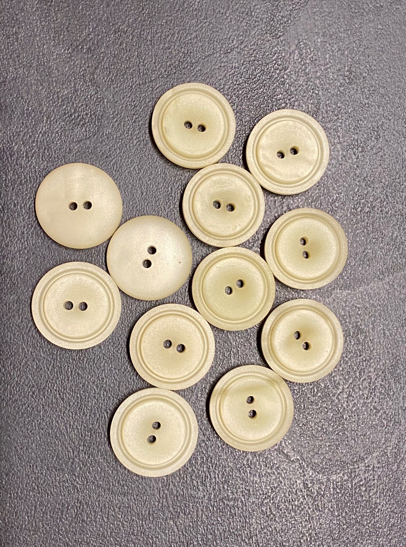 2-Loch Knöpfe in Creme mit eingefräßten Ring Duchmesser ca. 21 mm Befestigung 2-Loch Wir verkaufen diesen Knopf in Packungen zu ca. 20 g (ca.12 Stück)