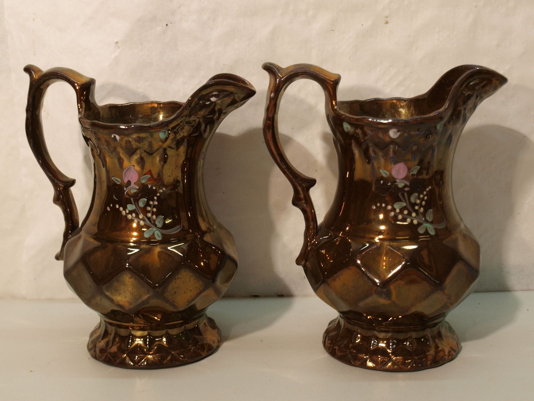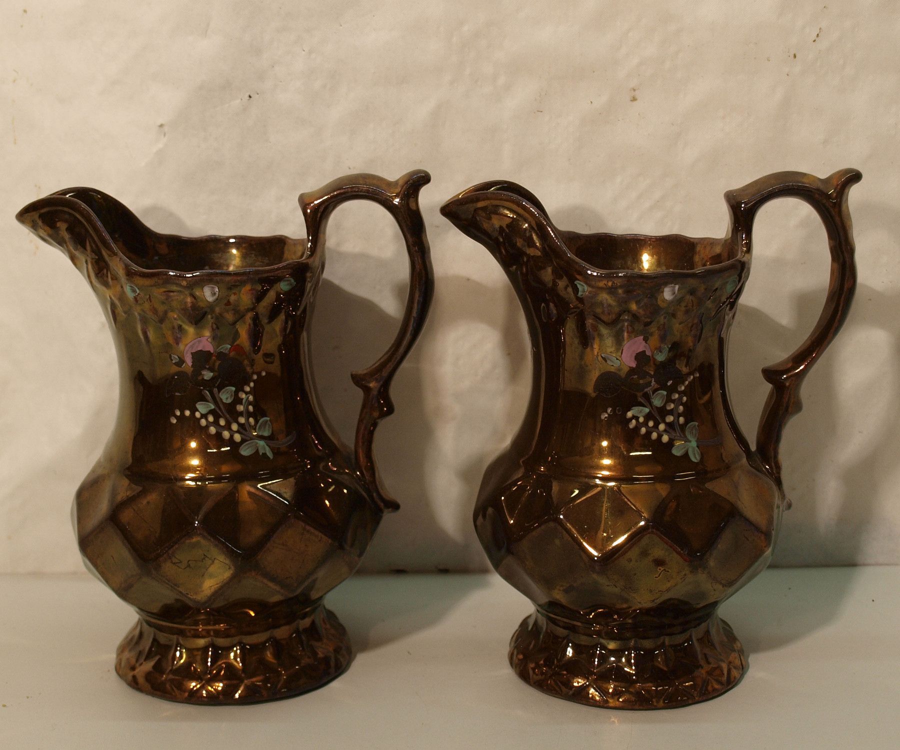 2 Milchkännchen um1820 (Biedermeier) . Ohne Marke . Handgemalt. Mit guter Kupferglasur (siehe Foto). Maße: Höhe 17 cm. Antikes am Deich - Inh: Oliver Kipp-Trense