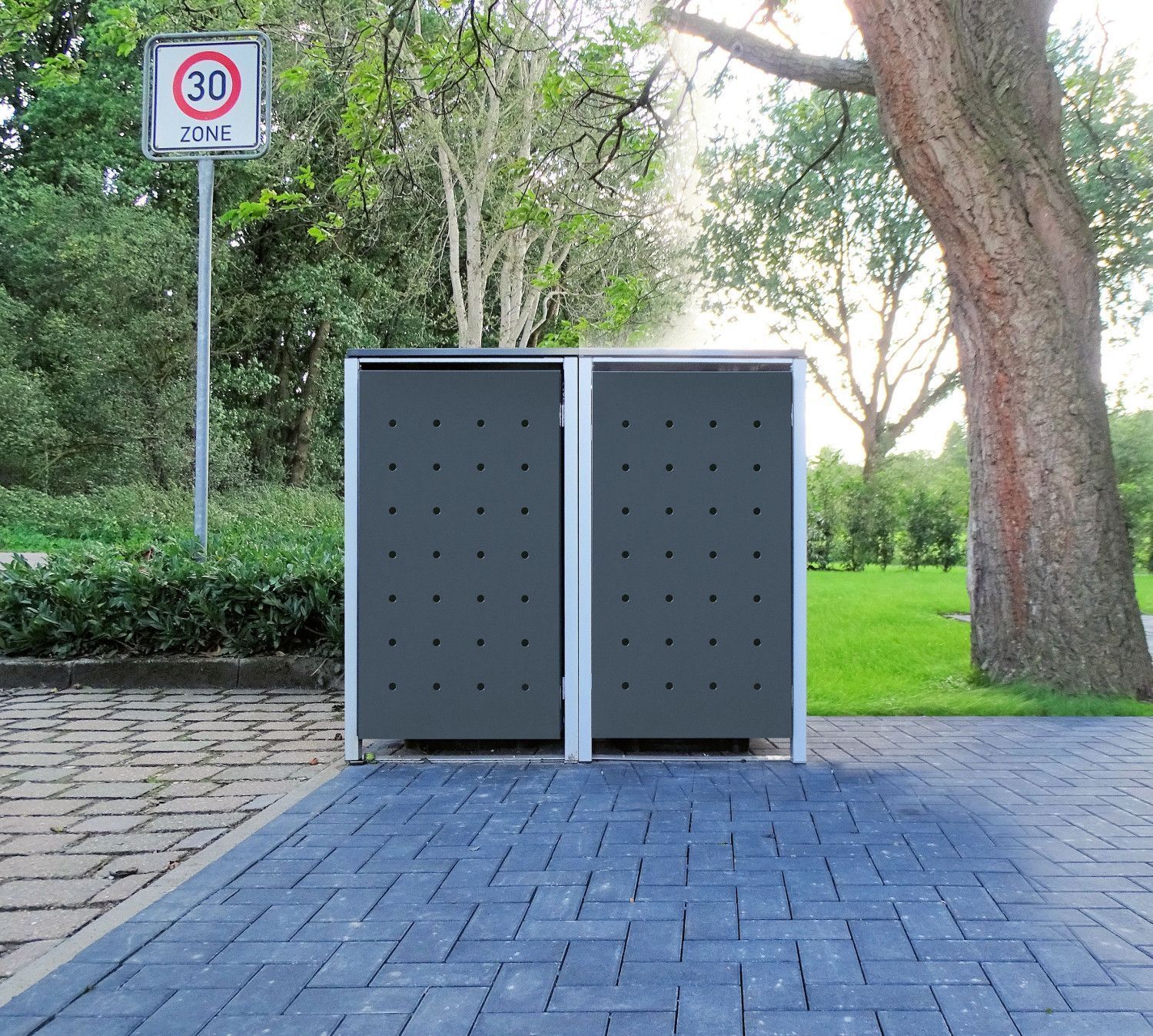 2 Mülltonnenboxen Modell No.1 Anthrazitgrau für 120 Liter Mülltonnen / witterungsbeständig durch Pulverbeschichtung / mit Klappdeckel und Fronttür