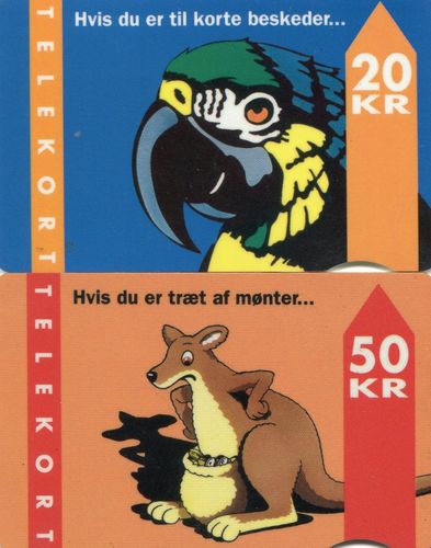 2 schöne Tier-Telefonkarten aus Dänemark: Papagei + Känguruh