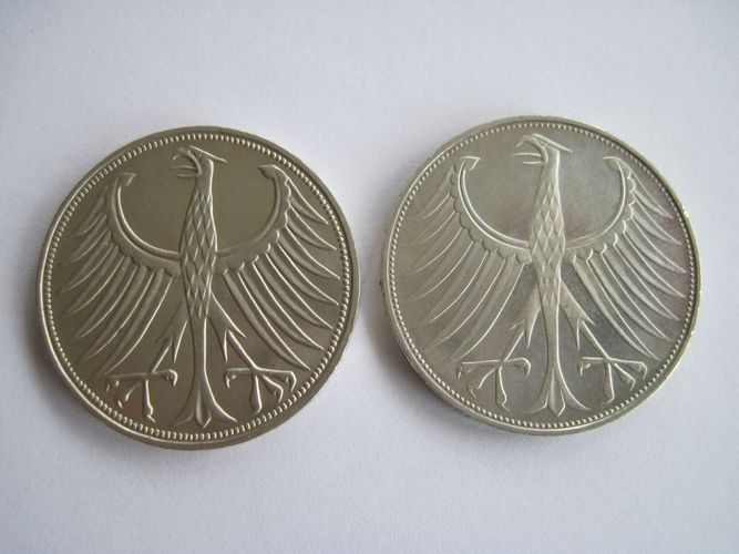 2 Silbermünzen 5 DM 1971 F + 1974 G Silberadler, Silber