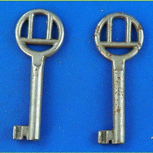 2 Stück alte Möbelschlüssel / Truhenschlüssel ca. 55 mm mit Stirnlochbohrung (4)