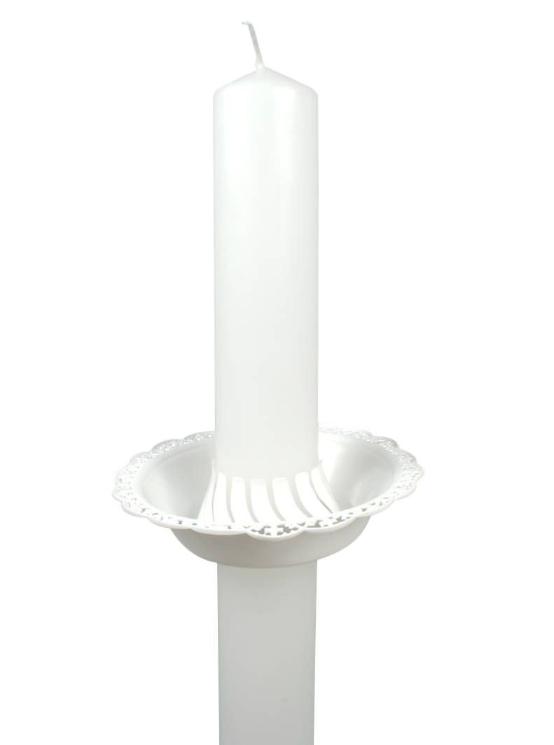 2 Stück Tropfenfänger-Kunststoff, für Kerzen bis 40mm Durchmesser Ideal für Tauf-. Kommunionkerzen etc. Material: Kunststoff Farbe: weiss Größe 80mm Durchmesser x 20mm Höhe Für Kerzen bis Durchmesser 40mm geeignet
