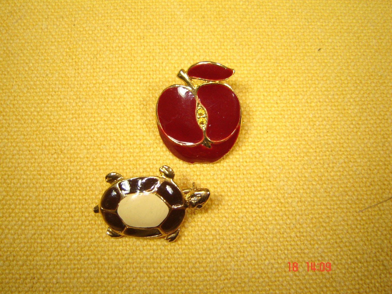 2 Stück Vintage Brosche goldfarben emailliert Apfel Schildkröte Z p