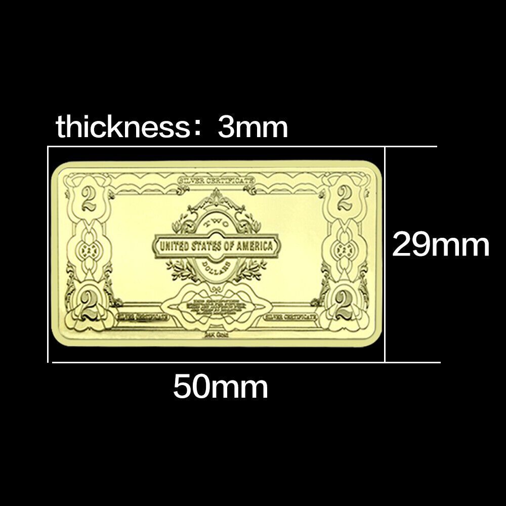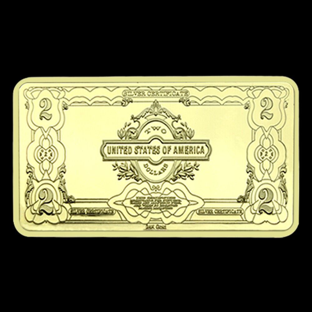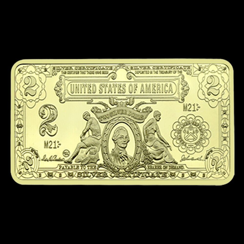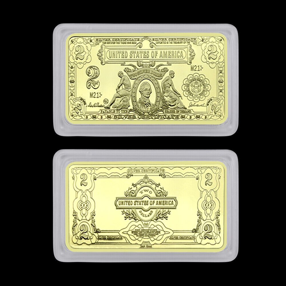 Schöne seltene USA Medaillen Barren USA 2 Dollar wie abgebildet Technische Information zum Artikel Material: vergoldet Gewicht ca.: 31,2 Gramm Größe ca.: 50 x 29 mm x 30 mm Erhaltung: Polierte Platte Verpackung: Kapsel Erhaltung: Polierte Platte (Optische Mängel möglich) Verpackung: Kapsel Ideal für