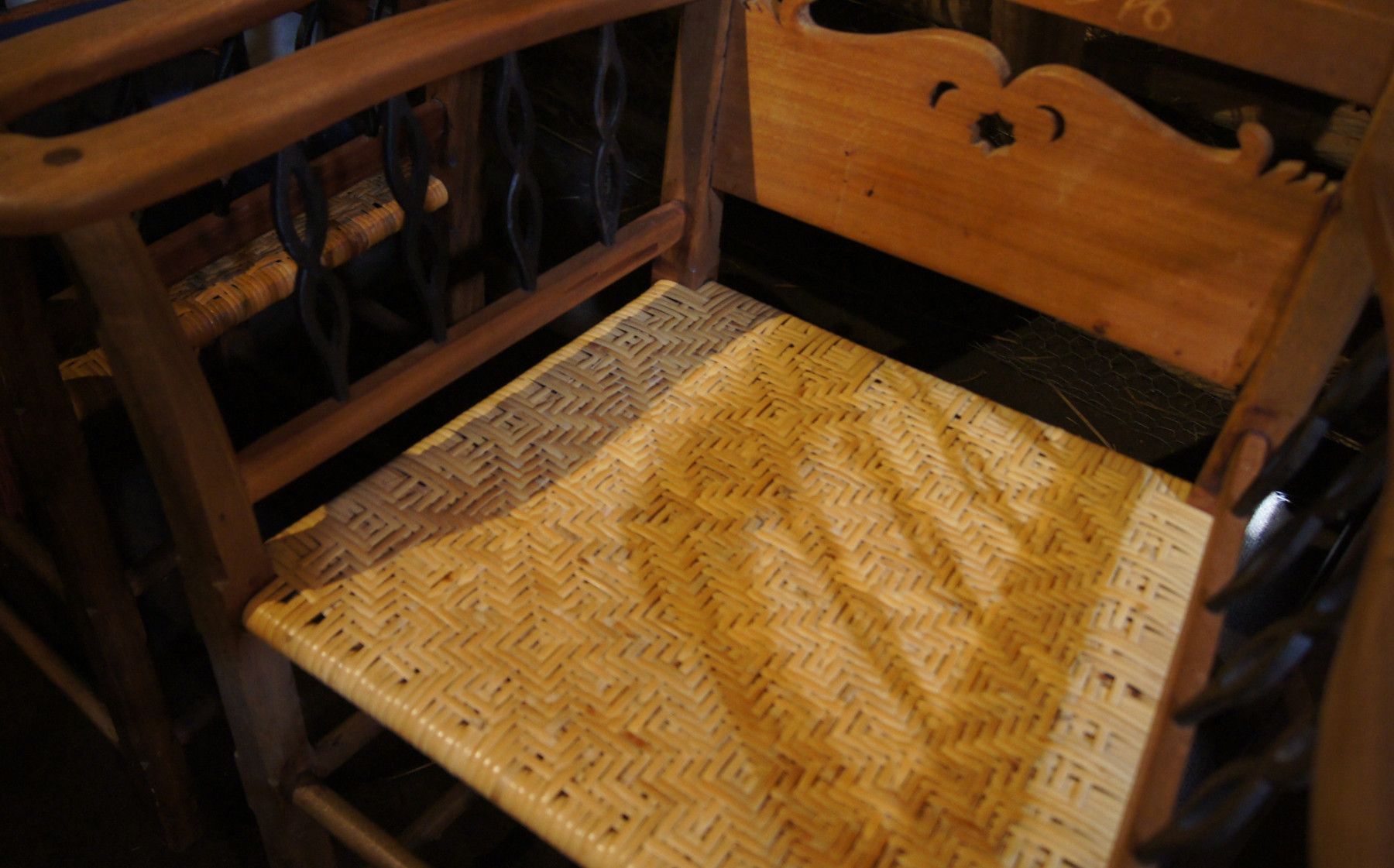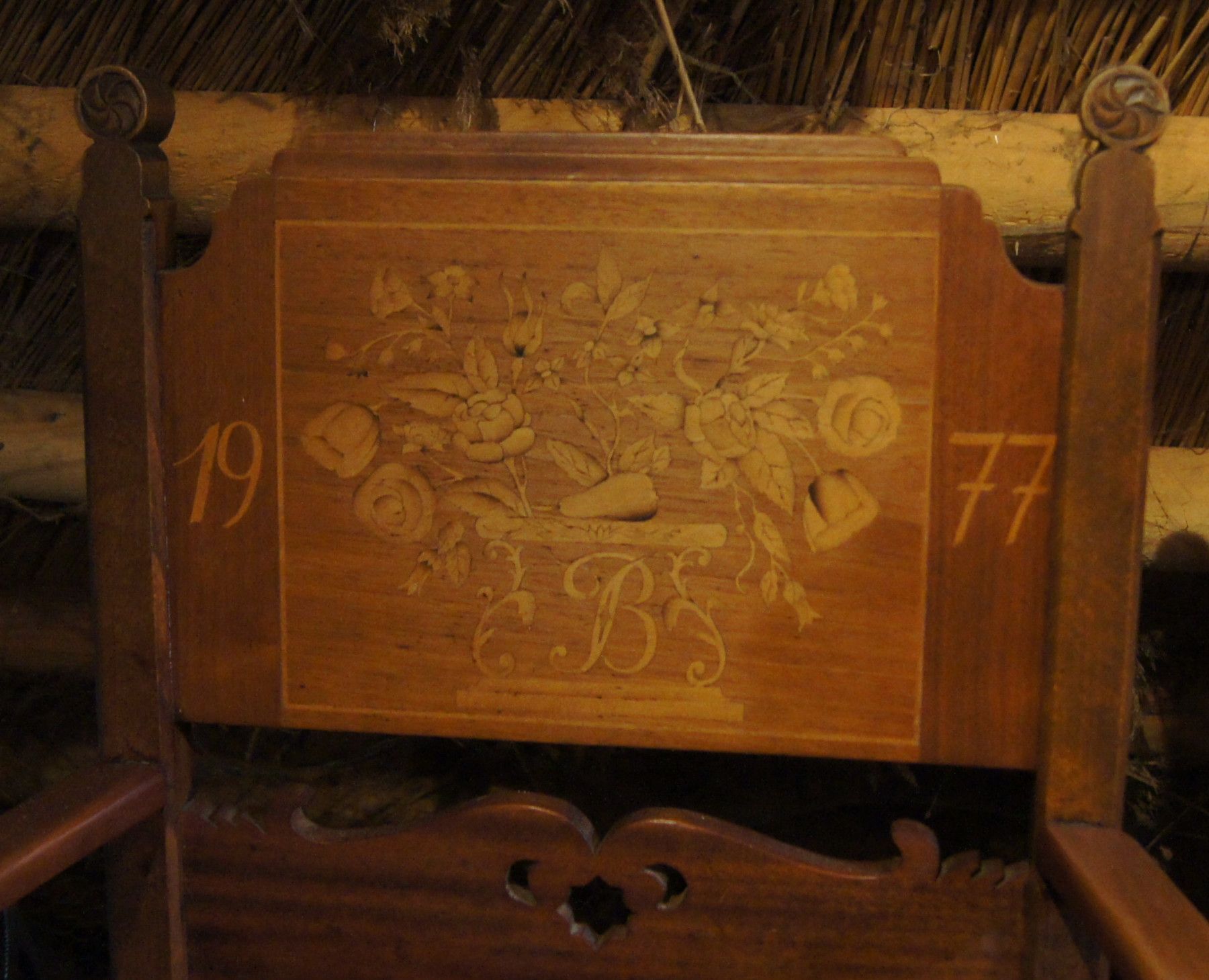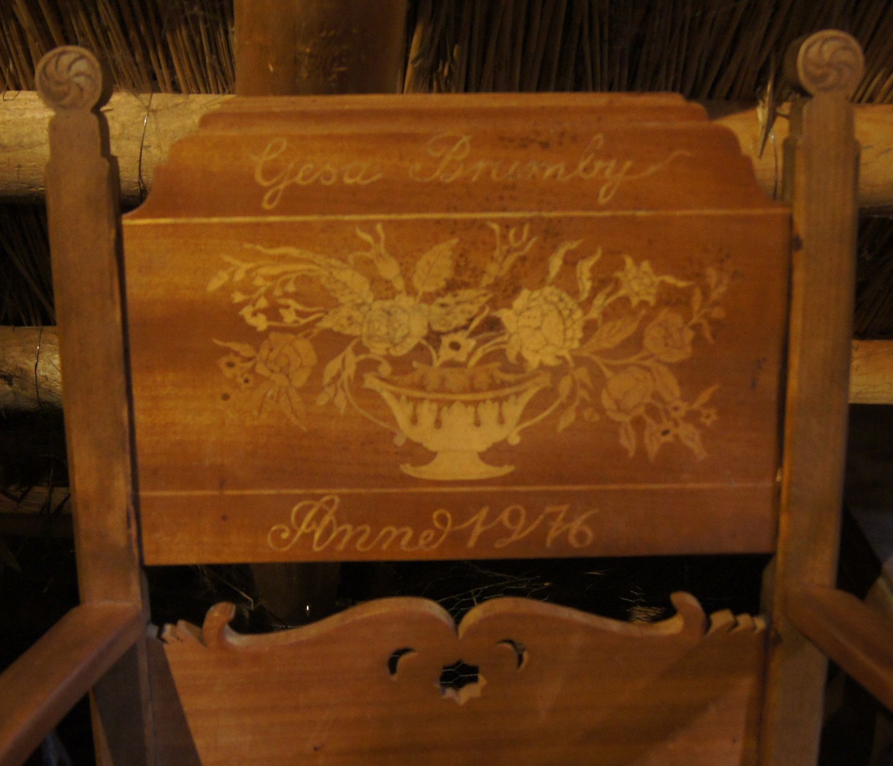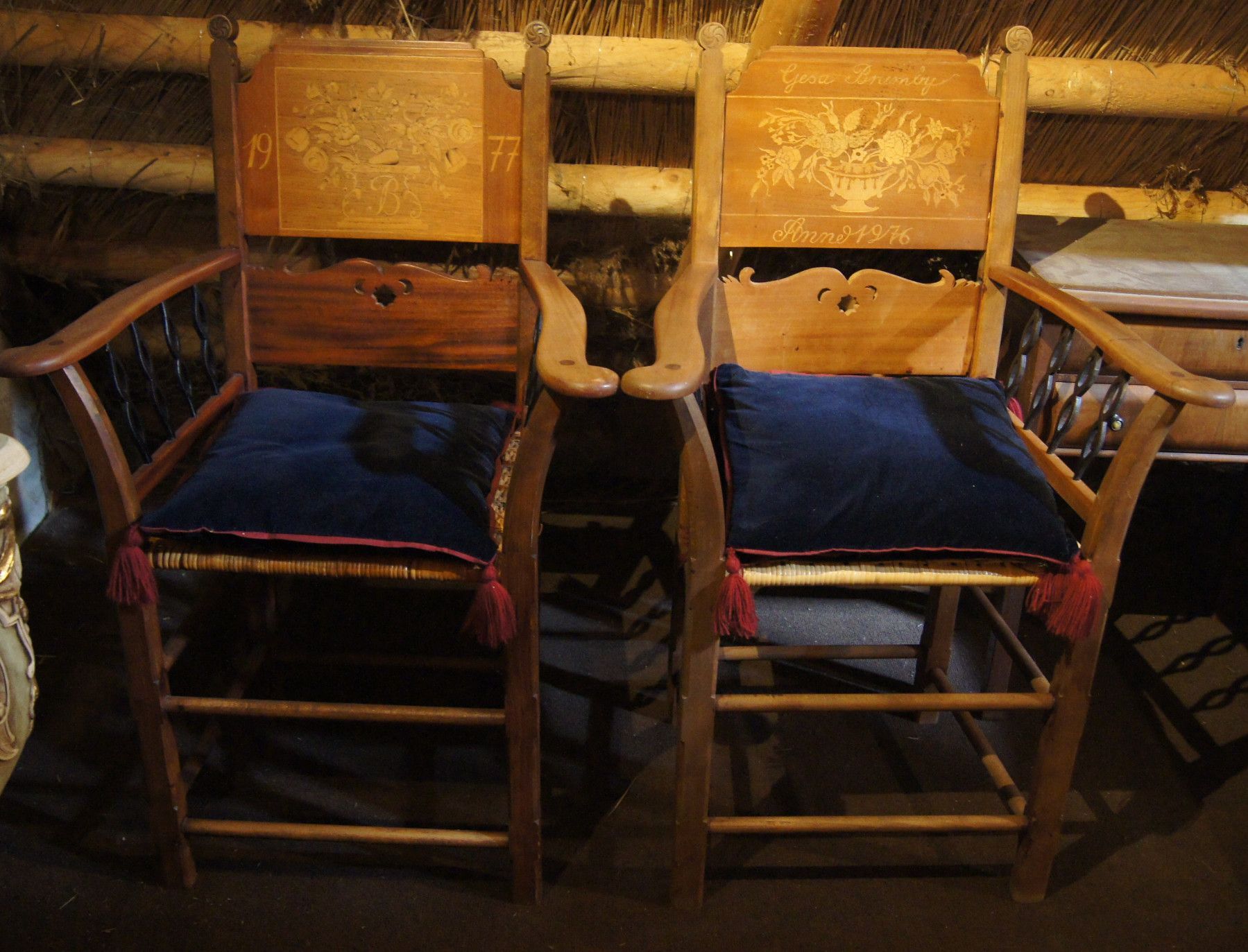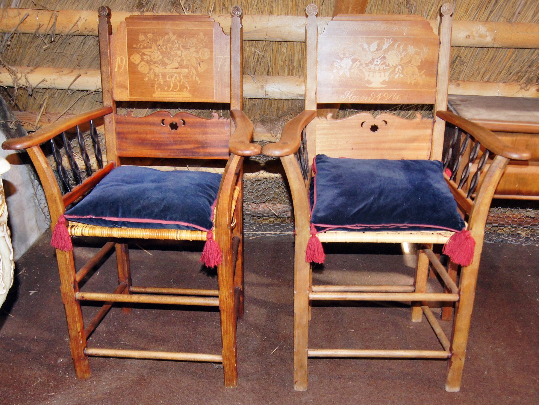 2 Armlehn-Stühle um 1900. Die Rückenteile wurden 1976 und 1977 mit neuen Namen versehen. Herkunft: Hamburg-Vierlanden. Material: Eiche mittel massiv. Polsterung: Rattan + Kissen. Maße: H 104, B 67, T 50, Sitzhöhe 50 cm. Normale Gebrauchsspuren. Lieferung im Umkreis von 30 km frei Haus! Sonst Transpo