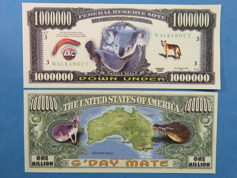 2 x 1 Million Dollar Sammelscheine Koala Bär Technische Information zum Artikel Material: Papier Größe: ca. original Größe Erhaltung: Neu Neu, glatt und ohne Falten, ohne Hörner Das ideale Geschenk oder natürlich auch zum selber sammeln Natürlich handelt es sich hier nicht um echtes Geld sondern nur