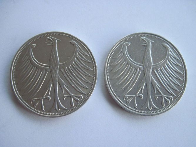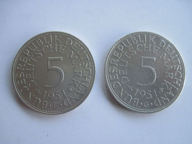 2 x 5 DM 1951 F + G alte Deutsche Mark, Silberadler, Heiermann Silber-Kursmünze von 1951-1974 Metall: Silber 625er Gewicht je 11,2 g Prägejahr: 1951 Durchmesser: 29 mm Münzstätte: G Karlsruhe + F Stuttgart Vorderseite: Wert „5“ umgeben von Umschriften „BUNDESREPUBLIK DEUTSCHLAND DEUTSCHE MARK“ , Jah