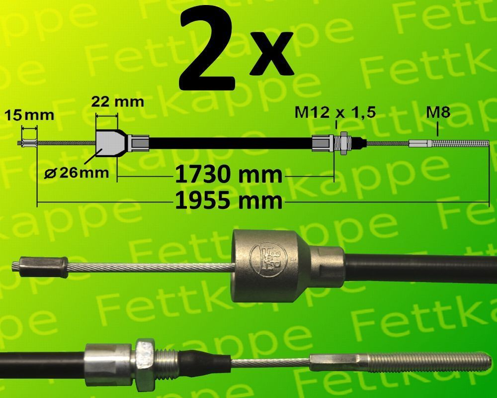 2 x ALKO / BPW-Bremsseil HL: 1730 mm - GL: 1955 mm Seil: Pressnippel / Gewinde M8 Hülle: Glocke 23,3/26,9 mm / Gewinde M12x1,5 für S1704-7 - S2005-7 - S2035-7 - S2304-7 - S2504-7 BPW Nr. 05.089.33.92.0 - ALKO Nr. 4017342